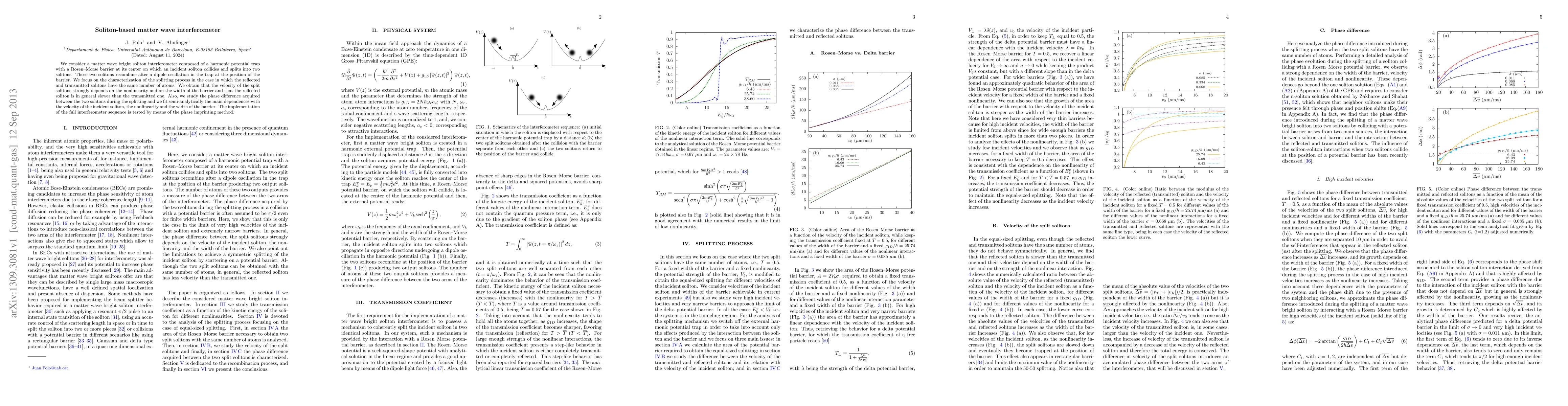 This paper investigates a soliton-based matter wave interferometer in a harmonic potential trap with a Rosen-Morse barrier, where solitons split and recombine. The study reveals that the velocity of the split solitons depends on nonlinearity and barrier width, with the reflected soliton generally slower than the transmitted one, and provides a semi-analytical fit for the phase difference acquired during the splitting process.