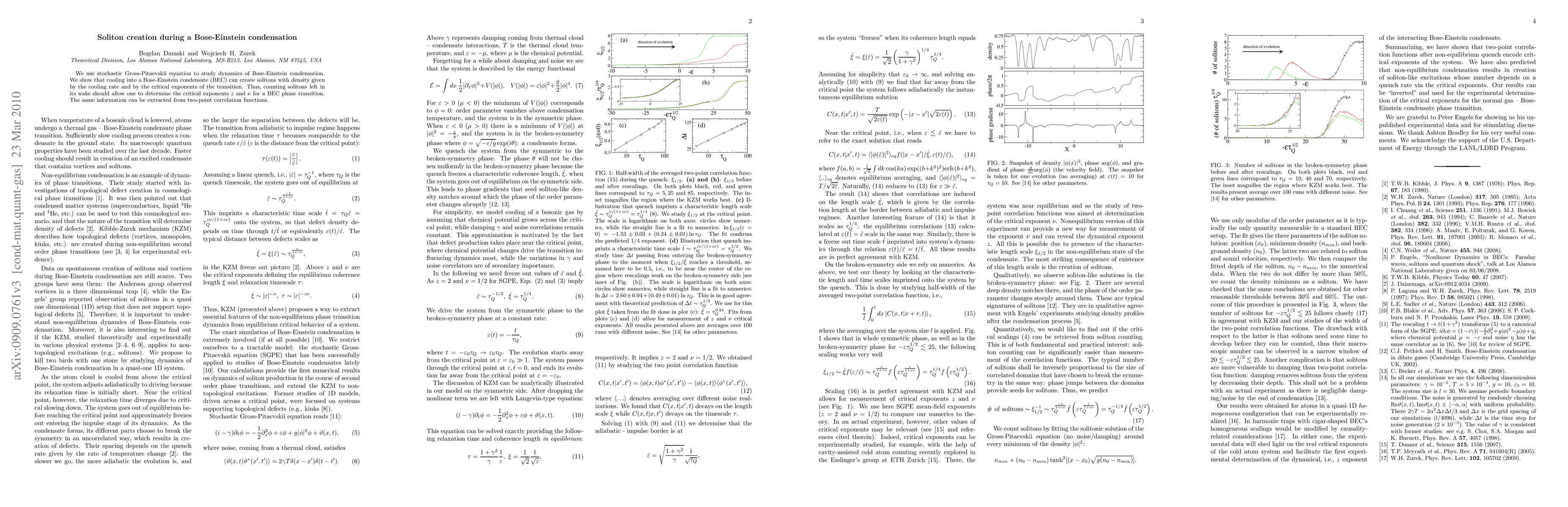 This paper investigates the dynamics of Bose-Einstein condensation using a stochastic Gross-Pitaevskii equation, demonstrating that solitons are created during the process, with their density correlating to the cooling rate and critical exponents. Counting these solitons can reveal critical exponents and information from two-point correlation functions.