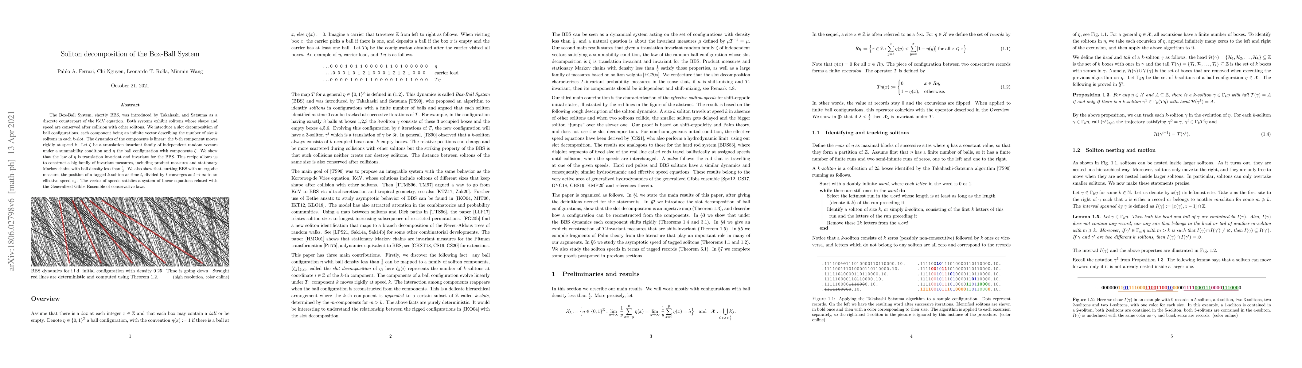 The Box-Ball System, shortly BBS, was introduced by Takahashi and Satsuma as a discrete counterpart of the KdV equation. Both systems exhibit solitons whose shape and speed are conserved after collision with other solitons. We introduce a slot decomposition of ball configurations, each component being an infinite vector describing the number of size $k$ solitons in each $k$-slot. The dynamics of the components is linear: the $k$-th component moves rigidly at speed $k$. Let $\zeta$ be a translation invariant family of independent random vectors under a summability condition and $\eta$ the ball configuration with components $\zeta$. We show that the law of $\eta$ is translation invariant and invariant for the BBS. This recipe allows us to construct a big family of invariant measures, including product measures and stationary Markov chains with ball density less than $\frac12$. We also show that starting BBS with an ergodic measure, the position of a tagged $k$-soliton at time $t$, divided by $t$ converges as $t\to\infty$ to an effective speed $v_k$. The vector of speeds satisfies a system of linear equations related with the Generalized Gibbs Ensemble of conservative laws.