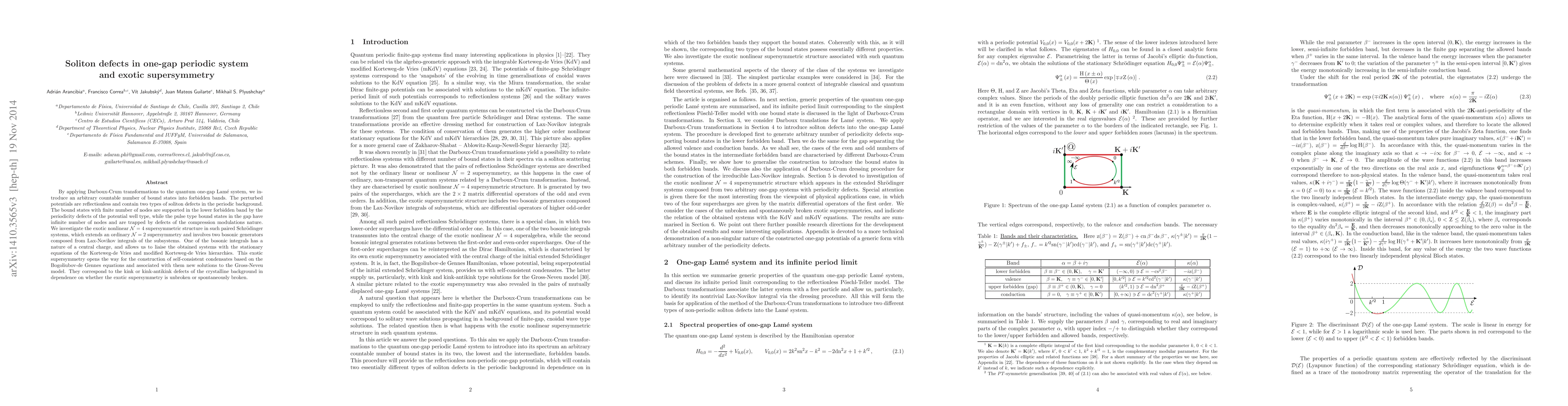 By applying Darboux-Crum transformations to the quantum one-gap Lame system, we introduce an arbitrary countable number of bound states into forbidden bands. The perturbed potentials are reflectionless and contain two types of soliton defects in the periodic background. The bound states with finite number of nodes are supported in the lower forbidden band by the periodicity defects of the potential well type, while the pulse type bound states in the gap have infinite number of nodes and are trapped by defects of the compression modulations nature. We investigate the exotic nonlinear N=4 supersymmetric structure in such paired Schrodinger systems, which extends an ordinary N=2 supersymmetry and involves two bosonic generators composed from Lax-Novikov integrals of the subsystems. One of the bosonic integrals has a nature of a central charge, and allows us to liaise the obtained systems with the stationary equations of the Korteweg-de Vries and modified Korteweg-de Vries hierarchies. This exotic supersymmetry opens the way for the construction of self-consistent condensates based on the Bogoliubov-de Gennes equations and associated with them new solutions to the Gross-Neveu model. They correspond to the kink or kink-antikink defects of the crystalline background in dependence on whether the exotic supersymmetry is unbroken or spontaneously broken.