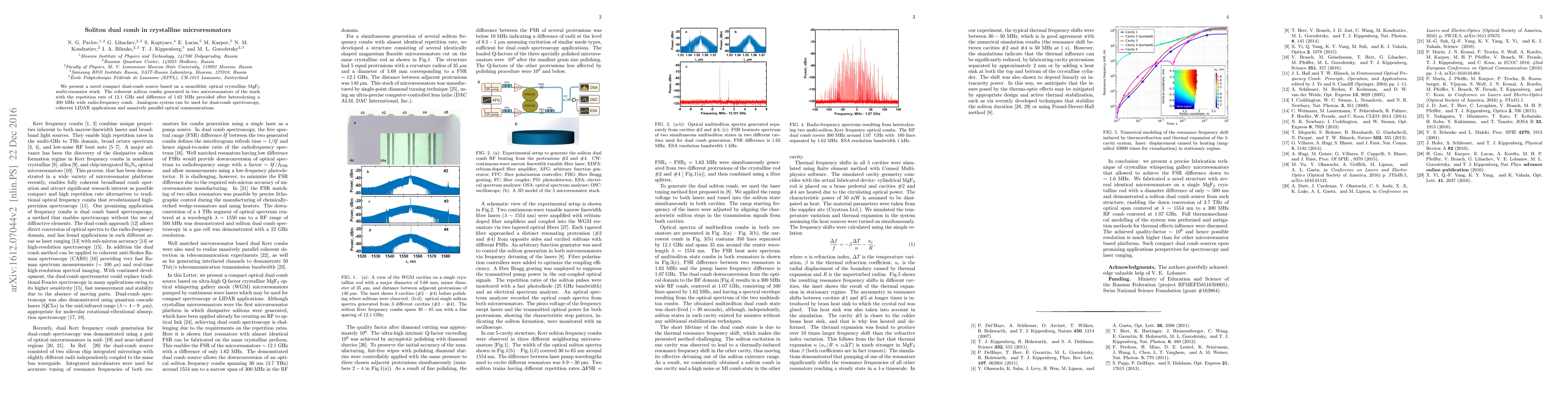 We present a novel compact dual-comb source based on a monolithic optical crystalline MgF$_2$ multi-resonator stack. The coherent soliton combs generated in two microresonators of the stack with the repetition rate of 12.1 GHz and difference of 1.62 MHz provided after heterodyning a 300 MHz wide radio-frequency comb. Analogous system can be used for dual-comb spectroscopy, coherent LIDAR applications and massively parallel optical communications.