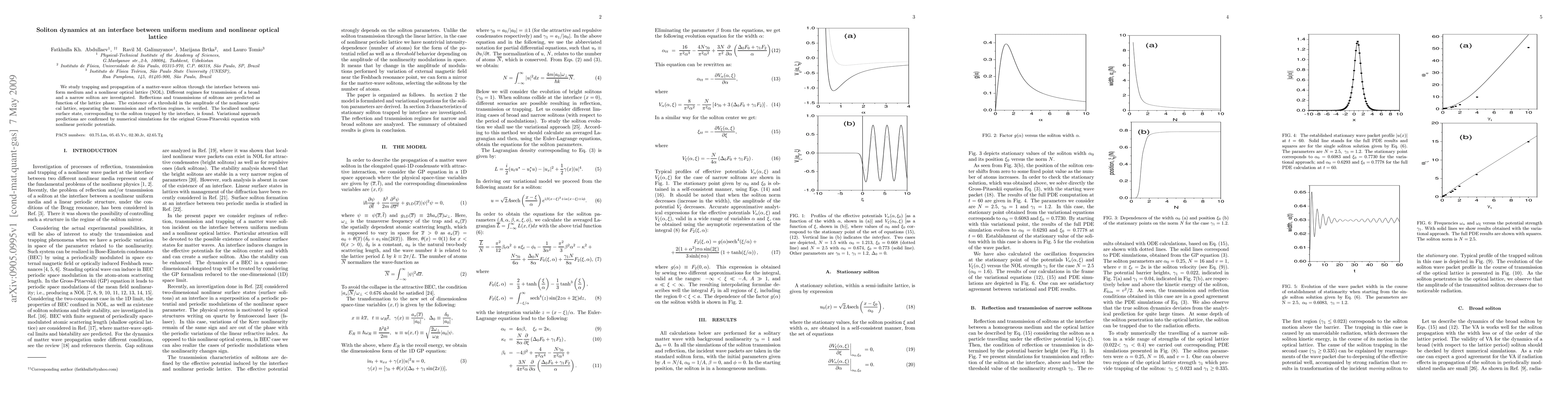 This paper investigates the dynamics of solitons at the interface between a uniform medium and a nonlinear optical lattice, examining both broad and narrow soliton behaviors. It identifies a threshold amplitude for the nonlinear optical lattice that determines soliton transmission or reflection, confirmed by numerical simulations of the Gross-Pitaevskii equation.