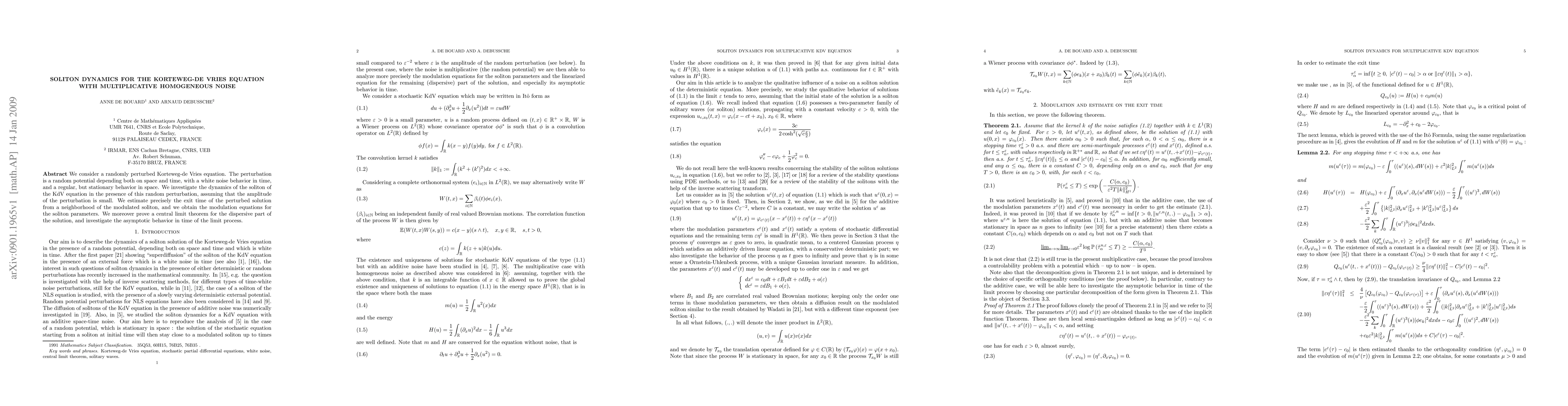 This paper studies the dynamics of solitons in a randomly perturbed Korteweg-de Vries equation with multiplicative homogeneous noise. It estimates the exit time of the perturbed solution from the modulated soliton and derives modulation equations for soliton parameters, while also proving a central limit theorem for the dispersive part of the solution.