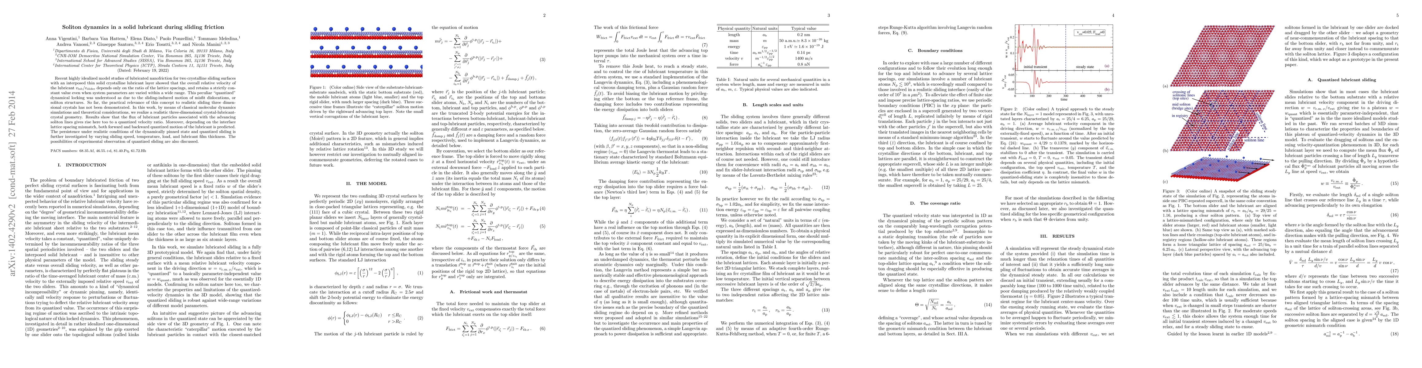 This study investigates the soliton dynamics in a solid lubricant during sliding friction, revealing a "quantized" velocity ratio in a realistic three-dimensional crystal-lubricant-crystal geometry. The findings show persistent quantized sliding under various conditions, suggesting potential for experimental observation.