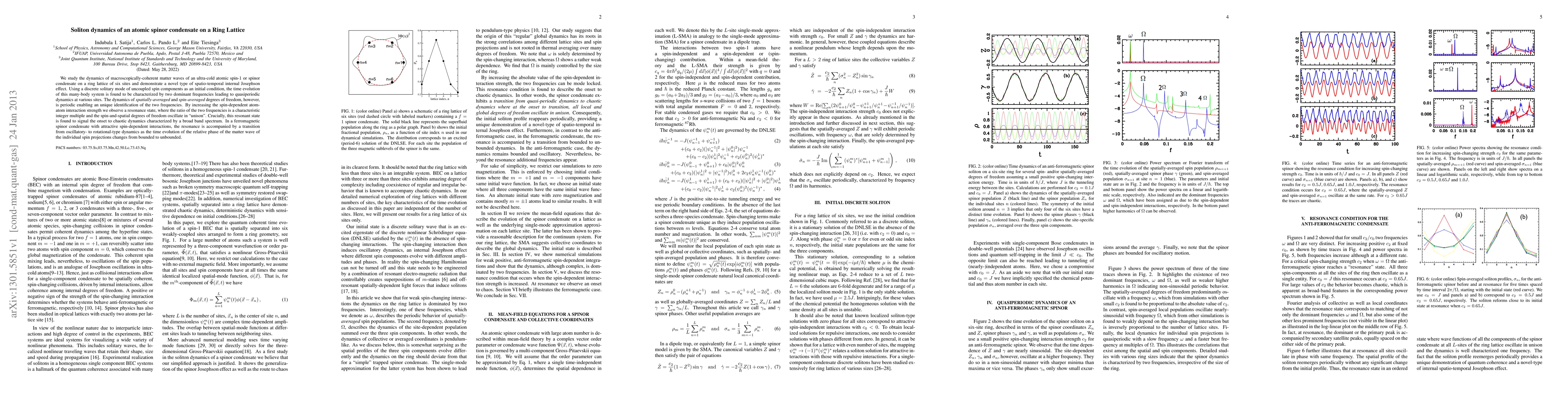This paper investigates the soliton dynamics in an ultra-cold atomic spinor condensate on a six-site ring lattice, revealing a novel spatio-temporal internal Josephson effect and quasiperiodic dynamics. The study identifies a resonance state where the system transitions to chaotic dynamics, marked by a transition from oscillatory to rotational behavior in ferromagnetic condensates.