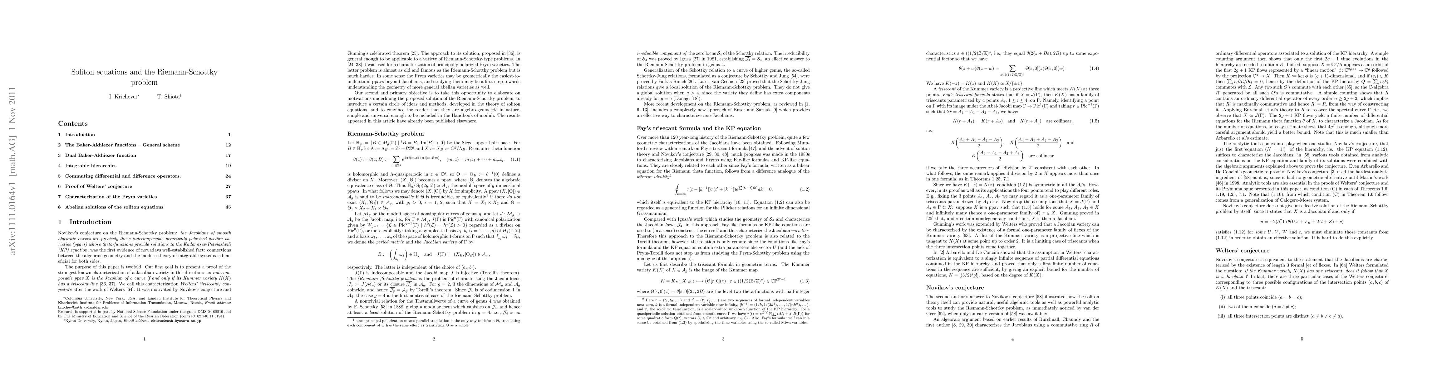 Novikov's conjecture on the Riemann-Schottky problem: {\it the Jacobians of smooth algebraic curves are precisely those indecomposable principally polarized abelian varieties (ppavs) whose theta-functions provide solutions to the Kadomtsev-Petviashvili (KP) equation}, was the first evidence of nowadays well-established fact: connections between the algebraic geometry and the modern theory of integrable systems is beneficial for both sides. The purpose of this paper is twofold. Our first goal is to present a proof of the strongest known characterization of a Jacobian variety in this direction: {\it an indecomposable ppav $X$ is the Jacobian of a curve if and only if its Kummer variety $K(X)$ has a trisecant line} and the solution of the characterization problem of principally polarized Prym varieties. The latter problem is almost as old and famous as the Riemann-Schottky problem but is much harder. In some sense the Prym varieties may be geometrically the easiest-to-understand ppavs beyond Jacobians, and studying them may be a first step towards understanding the geometry of more general abelian varieties as well. Our second and primary objective is to take this opportunity to elaborate on motivations underlining the proposed solution of the Riemann-Schottky problem, to introduce a certain circle of ideas and methods, developed in the theory of soliton equations, and to convince the reader that they are algebro-geometric in nature, simple and universal enough to be included in the Handbook of moduli.
