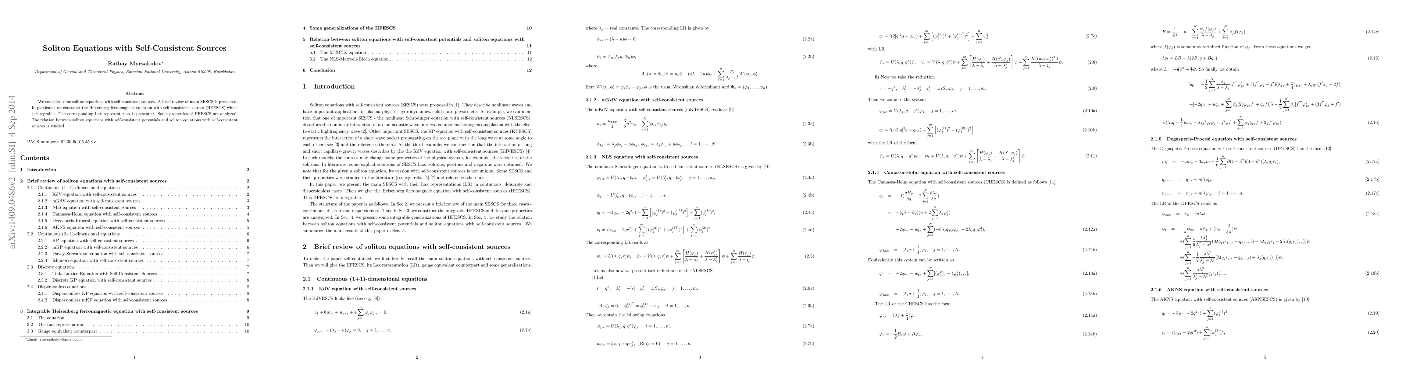 We consider some soliton equations with self-consistent sources. A brief review of main SESCS is presented. In particular we construct the Heisenberg ferromagneic equation with self-consistent sources (HFESCS) which is integrable. The corresponding Lax representation is presented. Some properties of HFESCS are analyzed. The relation between soliton equations with self-consistent potentials and soliton equations with self-consistent sources is studied.