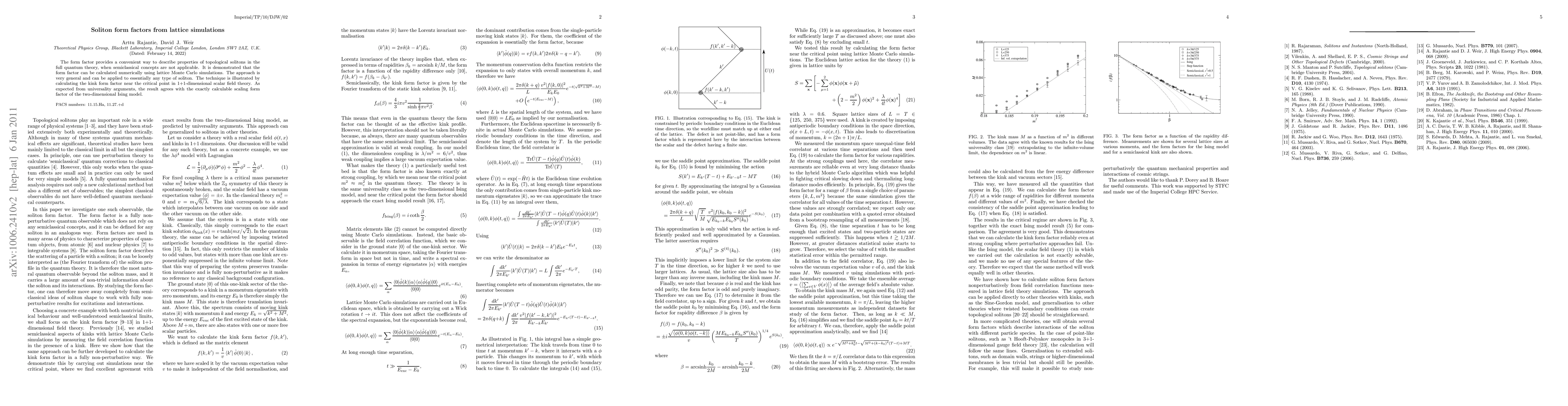 This research demonstrates a method to numerically calculate soliton form factors using lattice Monte Carlo simulations, applicable to various soliton types. The technique is validated by comparing the 1+1D scalar theory kink form factor with the Ising model's scaling form factor, confirming universality arguments.