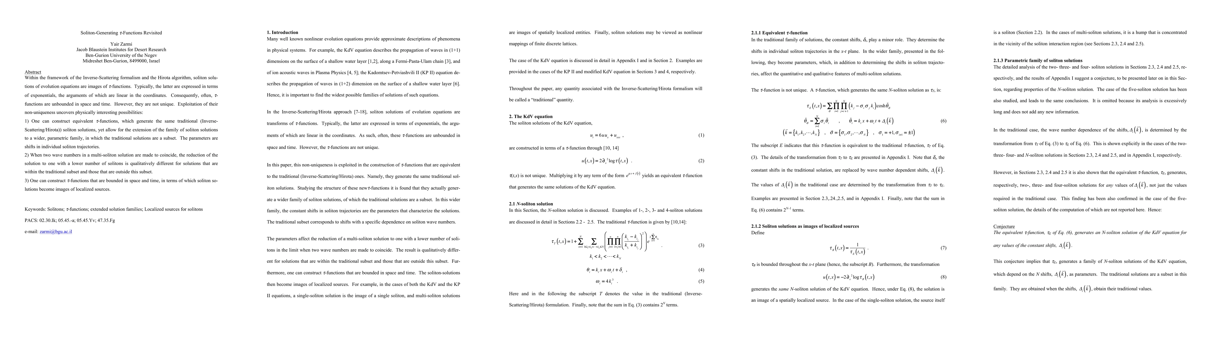 The paper revisits soliton-generating τ-functions within the Inverse-Scattering formalism and Hirota algorithm, exploring non-uniqueness to extend soliton families and introduce localized sources.