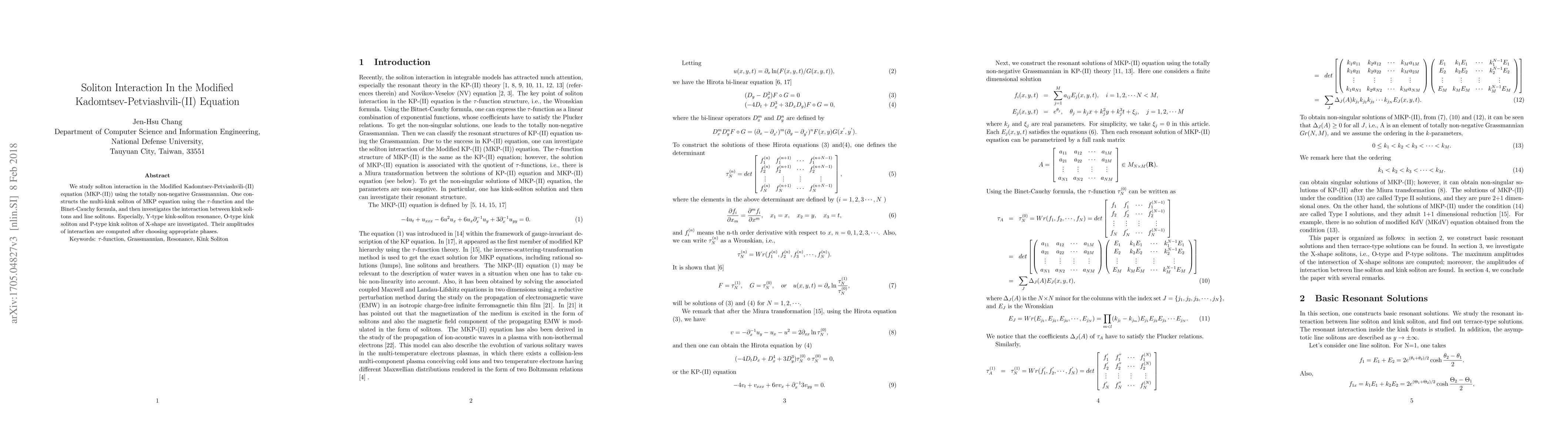 This paper investigates soliton interactions in the Modified Kadomtsev-Petviashvili-(II) equation using the totally non-negative Grassmannian. It constructs multi-kink solitons via the $\tau$-function and Binet-Cauchy formula, then examines Y-type, O-type, and P-type kink-soliton resonances, computing their interaction amplitudes.