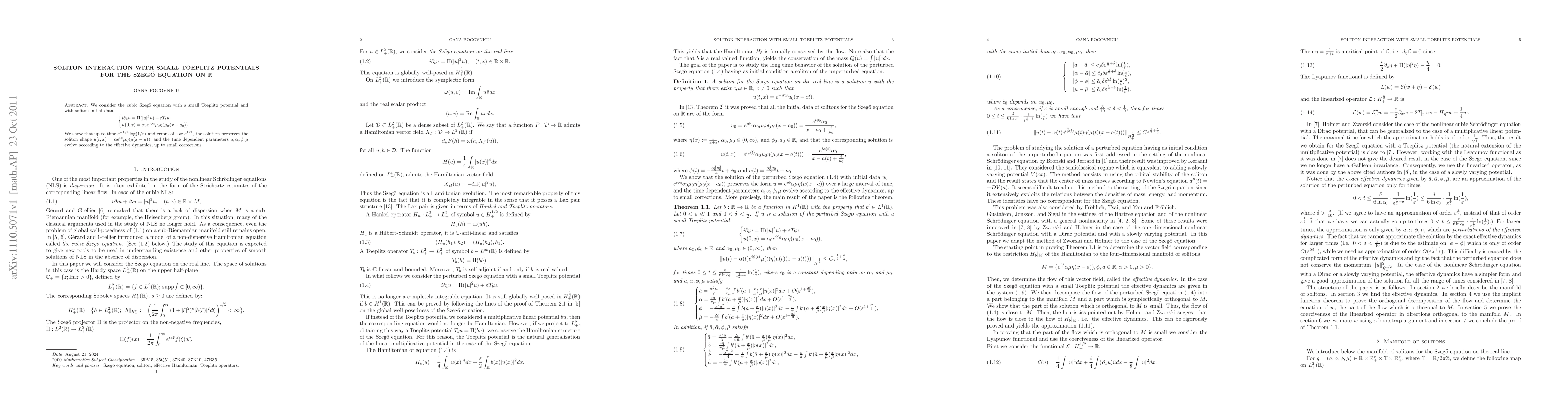 We consider the cubic Szego equation perturbed by a small Toeplitz potential (natural generalization of a multiplicative potential) and having as initial condition a soliton of the unperturbed equation. We show that the solution preserves the soliton shape for a long time, and we determine the effective ODEs satisfied by the modulation parameters of the soliton.