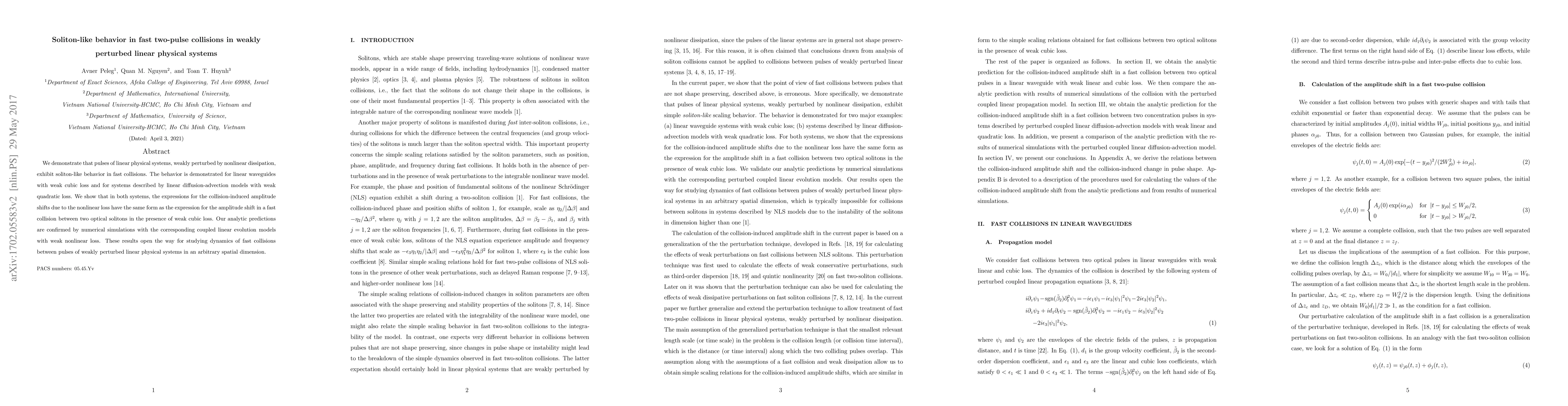 This paper demonstrates soliton-like behavior in fast collisions of pulses in weakly perturbed linear physical systems, showing similar amplitude shifts as optical solitons, confirmed by numerical simulations. The findings extend to linear waveguides and diffusion-advection models with weak quadratic loss.