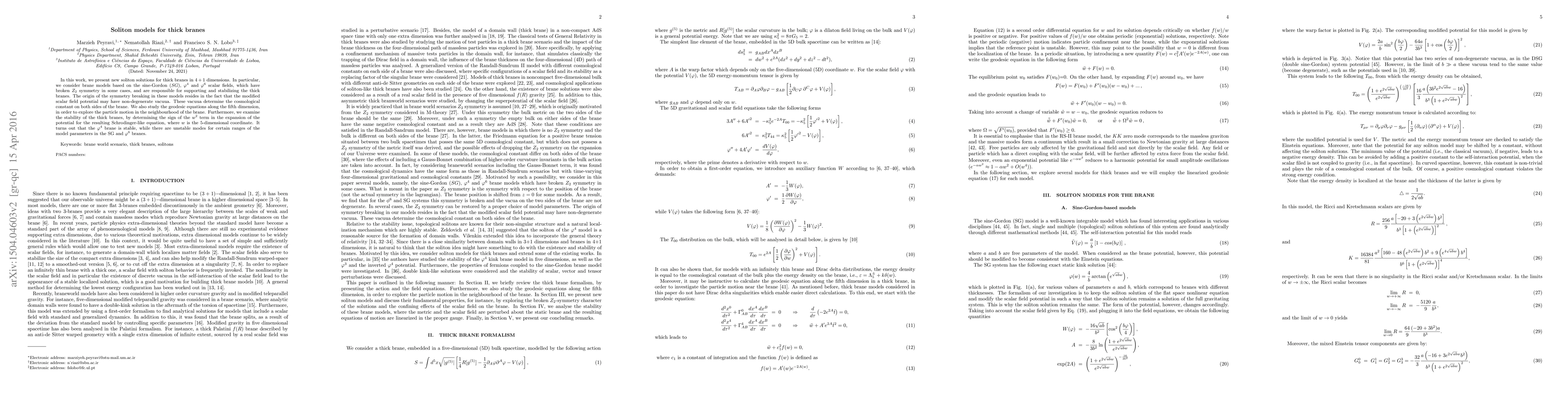 The research presents new soliton solutions for thick branes in 4+1 dimensions, considering brane models based on sine-Gordon (SG), φ⁴, and φ⁶ scalar fields, which support and stabilize the thick branes through broken Z₂ symmetry. The study also examines geodesic equations for particle motion near the brane and investigates brane stability by analyzing the sign of the w² term in the Schrodinger-like equation.