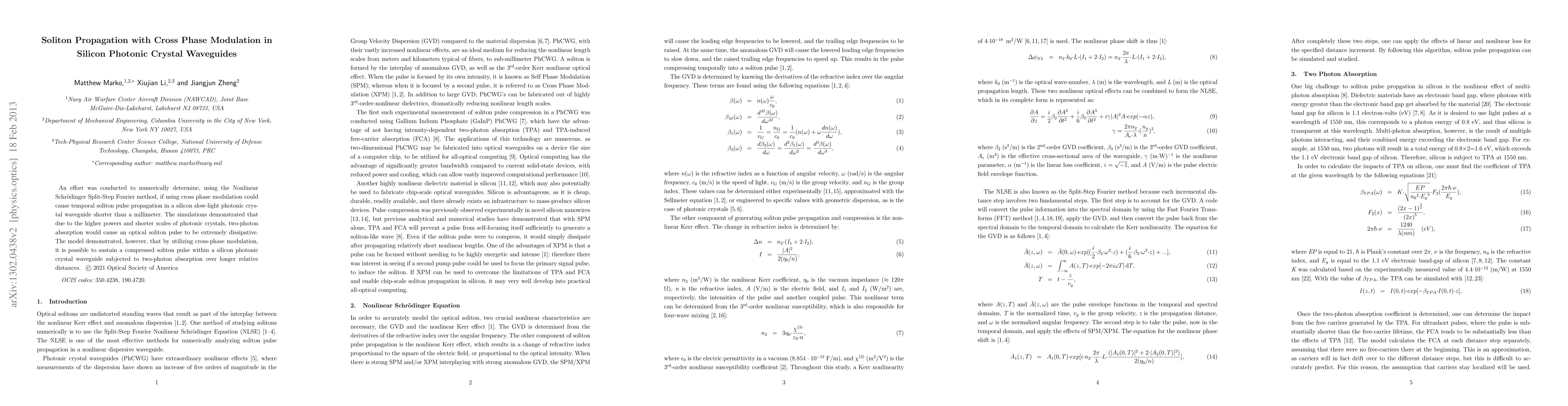 An effort was conducted to numerically determine, using the Nonlinear Schrodinger Split-Step Fourier method, if using cross phase modulation could cause temporal soliton pulse propagation in a silicon slow-light photonic crystal waveguide shorter than a millimeter. The simulations demonstrated that due to the higher powers and shorter scales of photonic crystals, two-photon absorption would cause an optical soliton pulse to be extremely dissipative. The model demonstrated, however, that by utilizing cross-phase modulation, it is possible to sustain a compressed soliton pulse within a silicon photonic crystal waveguide subjected to two-photon absorption over longer relative distances.