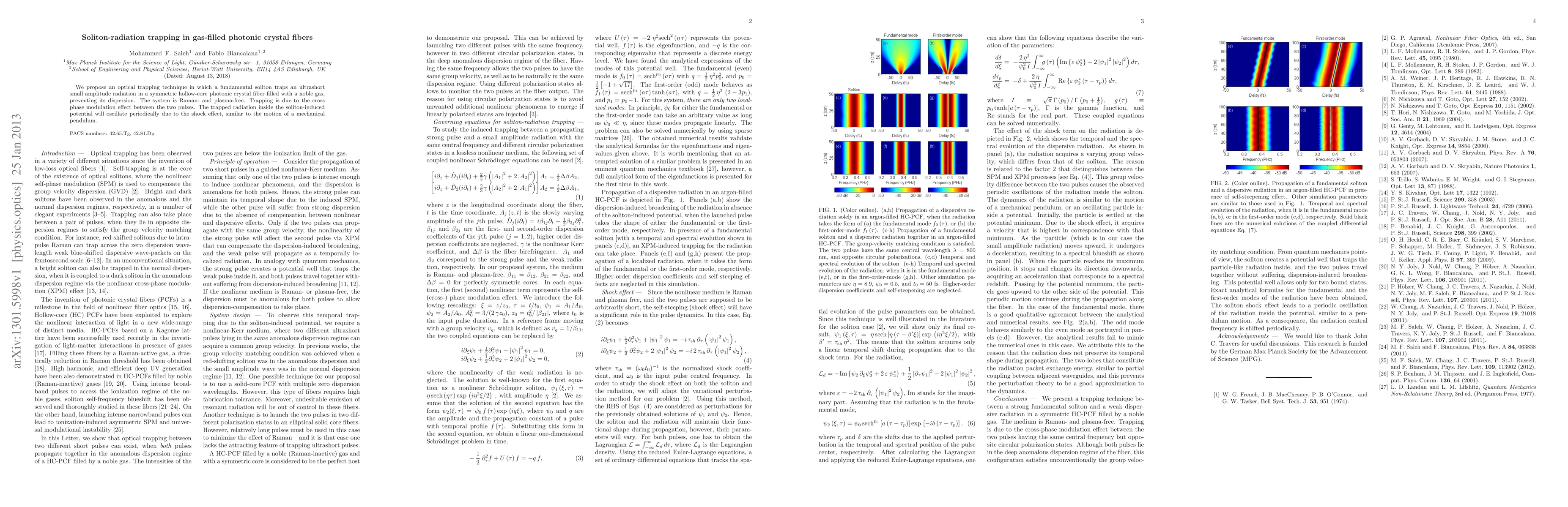 This paper proposes a novel optical trapping technique where a fundamental soliton captures and confines an ultrashort radiation pulse within a gas-filled photonic crystal fiber, utilizing cross phase modulation to prevent dispersion, and enabling periodic oscillations akin to a mechanical pendulum. The method is free from Raman and plasma effects.