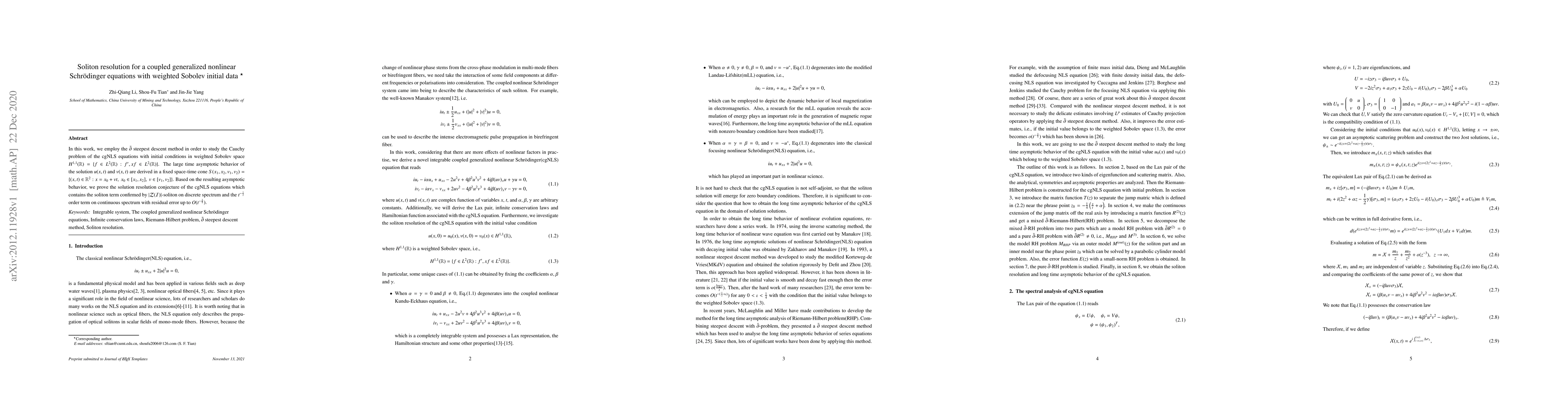 In this work, we employ the $\bar{\partial}$ steepest descent method in order to study the Cauchy problem of the cgNLS equations with initial conditions in weighted Sobolev space $H^{1,1}(\mathbb{R})=\{f\in L^{2}(\mathbb{R}): f',xf\in L^{2}(\mathbb{R})\}$. The large time asymptotic behavior of the solution $u(x,t)$ and $v(x,t)$ are derived in a fixed space-time cone $S(x_{1},x_{2},v_{1},v_{2})=\{(x,t)\in\mathbb{R}^{2}: x=x_{0}+vt, ~x_{0}\in[x_{1},x_{2}], ~v\in[v_{1},v_{2}]\}$. Based on the resulting asymptotic behavior, we prove the solution resolution conjecture of the cgNLS equations which contains the soliton term confirmed by $|\mathcal{Z}(\mathcal{I})|$-soliton on discrete spectrum and the $t^{-\frac{1}{2}}$ order term on continuous spectrum with residual error up to $O(t^{-\frac{3}{4}})$.