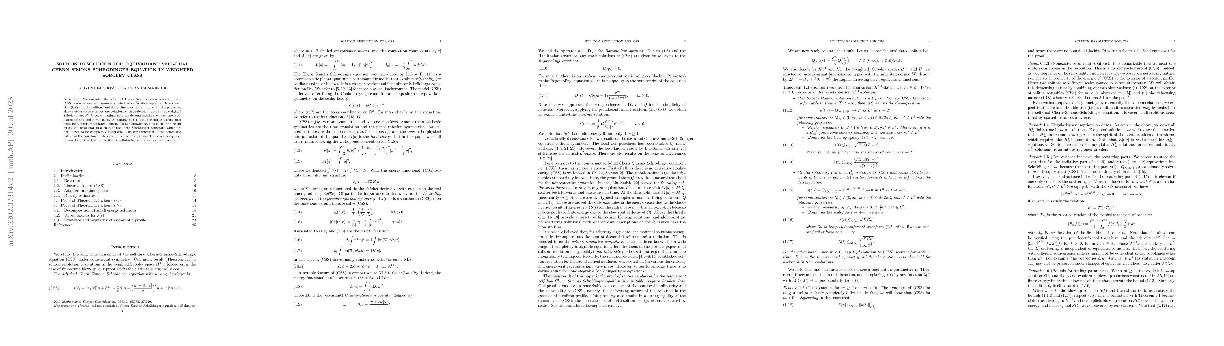 We consider the self-dual Chern-Simons-Schr\"odinger equation (CSS) under equivariant symmetry, which is a $L^{2}$-critical equation. It is known that (CSS) admits solitons and finite-time blow-up solutions. In this paper, we show soliton resolution for any solutions with equivariant data in the weighted Sobolev space $H^{1,1}$: every maximal solution decomposes into at most one modulated soliton and a radiation. A striking fact is that the nonscattering part must be a single modulated soliton. To our knowledge, this is the first result on soliton resolution in a class of nonlinear Schr\"odinger equations which are not known to be completely integrable. The key ingredient is the defocusing nature of the equation in the exterior of a soliton profile. This is a consequence of two distinctive features of (CSS): self-duality and non-local nonlinearity.