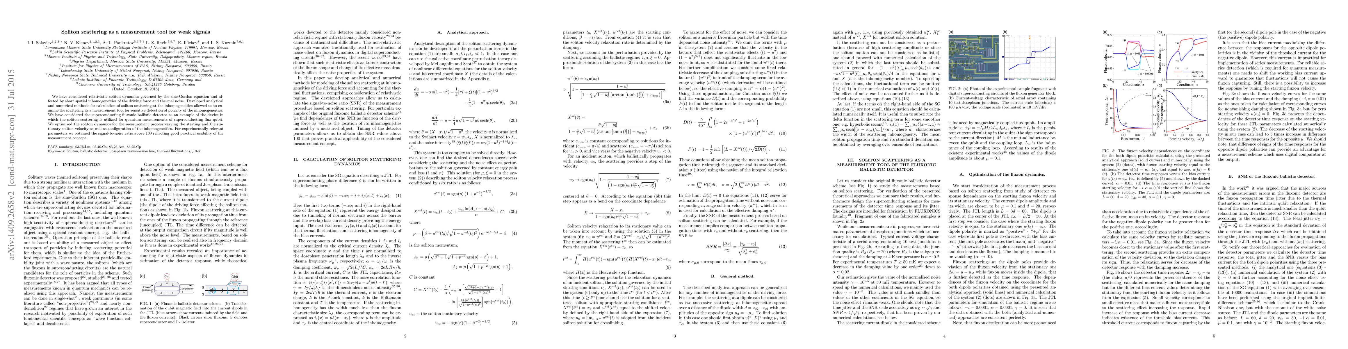 We have considered relativistic soliton dynamics governed by the sine-Gordon equation and affected by short spatial inhomogeneities of the driving force and thermal noise. Developed analytical and numerical methods for calculation of soliton scattering at the inhomogeneities allowed us to examine the scattering as a measurement tool for sensitive detection of polarity of the inhomogeneities. We have considered the superconducting fluxonic ballistic detector as an example of the device in which the soliton scattering is utilized for quantum measurements of superconducting flux qubit. We optimized the soliton dynamics for the measurement process varying the starting and the stationary soliton velocity as well as configuration of the inhomogeneities. For experimentally relevant parameters we obtained the signal-to-noise ratio above 100 reflecting good practical usability of the measurement concept.