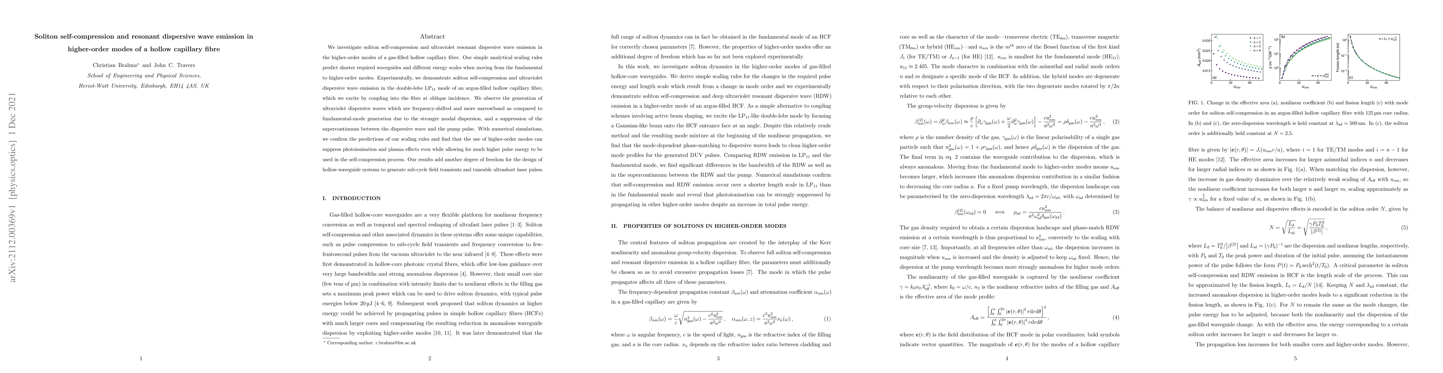 This paper investigates soliton self-compression and ultraviolet dispersive wave emission in higher-order modes of gas-filled hollow capillary fibres, demonstrating shorter waveguide requirements and different energy scales compared to fundamental modes. Experimental and numerical results show enhanced ultraviolet wave emission and suppression of photoionisation, suggesting higher-order modes for advanced laser pulse generation.