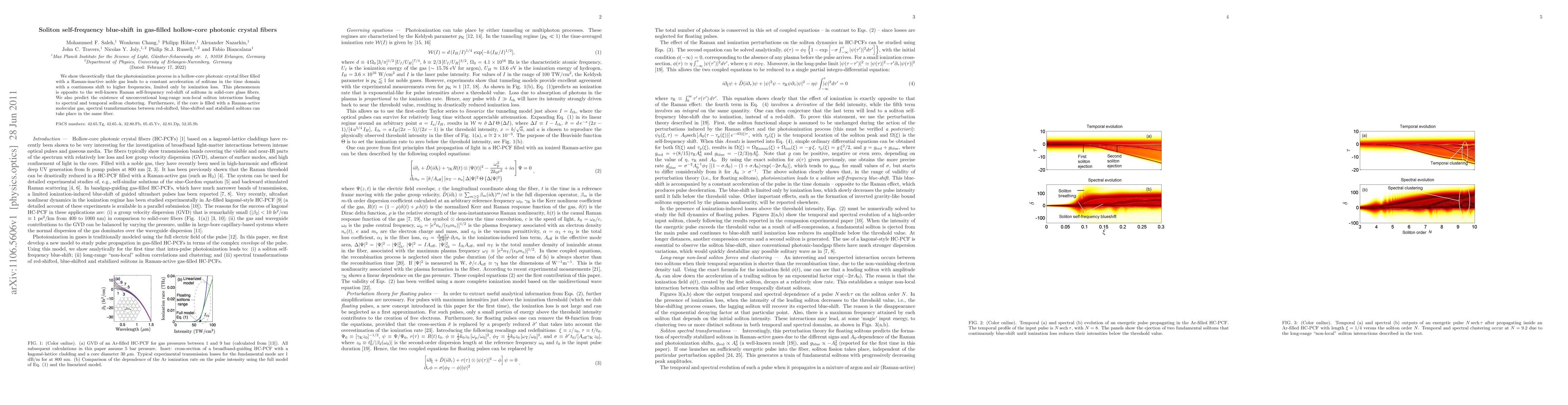 This research theoretically demonstrates that photoionization in gas-filled hollow-core photonic crystal fibers causes solitons to undergo a blue-shift in frequency, contrasting the Raman red-shift in solid-core fibers. It also predicts novel non-local soliton interactions and spectral transformations depending on the gas type.