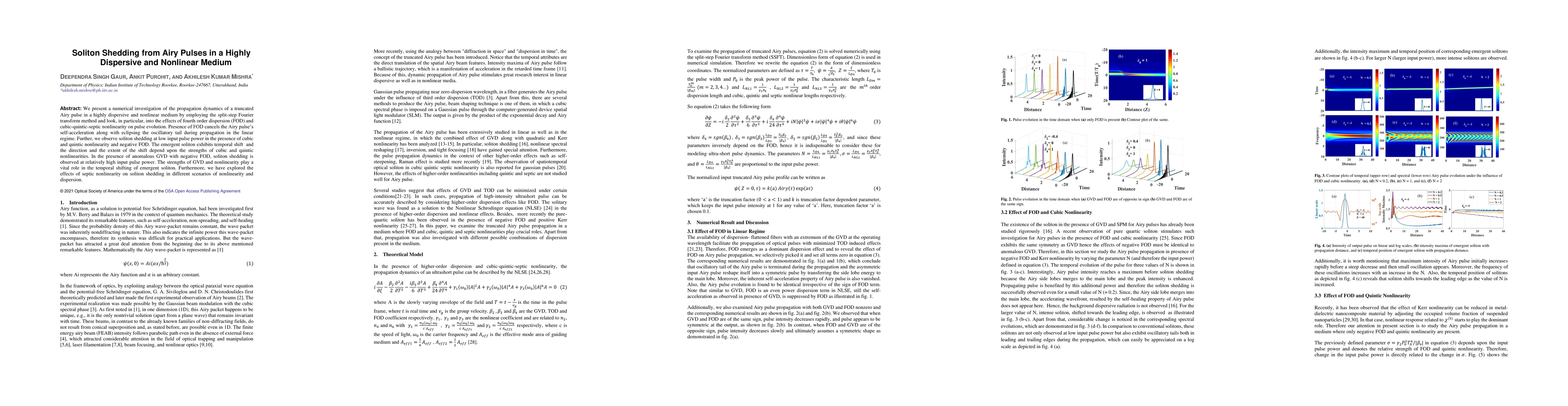 This paper investigates the dynamics of truncated Airy pulses in highly dispersive and nonlinear media, revealing that fourth-order dispersion cancels Airy pulse self-acceleration and oscillatory tails. It also demonstrates soliton shedding at low input power influenced by cubic-quintic-septic nonlinearity and negative fourth-order dispersion, with soliton temporal shift dependent on nonlinearity strengths.