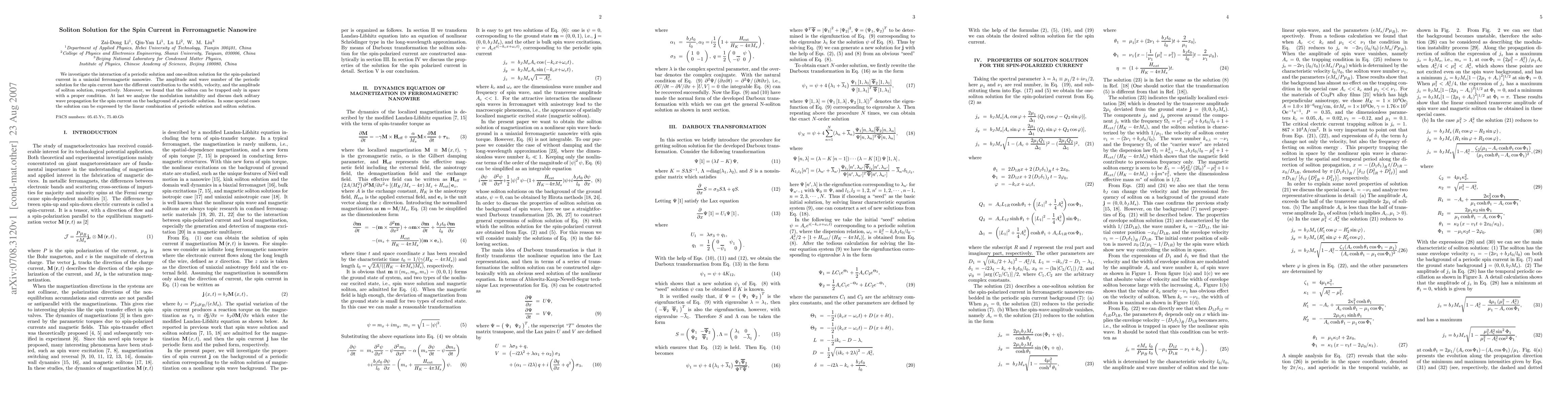 This paper explores the soliton solutions for spin-polarized current in ferromagnetic nanowires, highlighting the distinct contributions of periodic and soliton solutions to the soliton's width, velocity, and amplitude. It also examines the conditions under which solitons can be trapped and discusses modulation instability and dark solitary wave propagation.