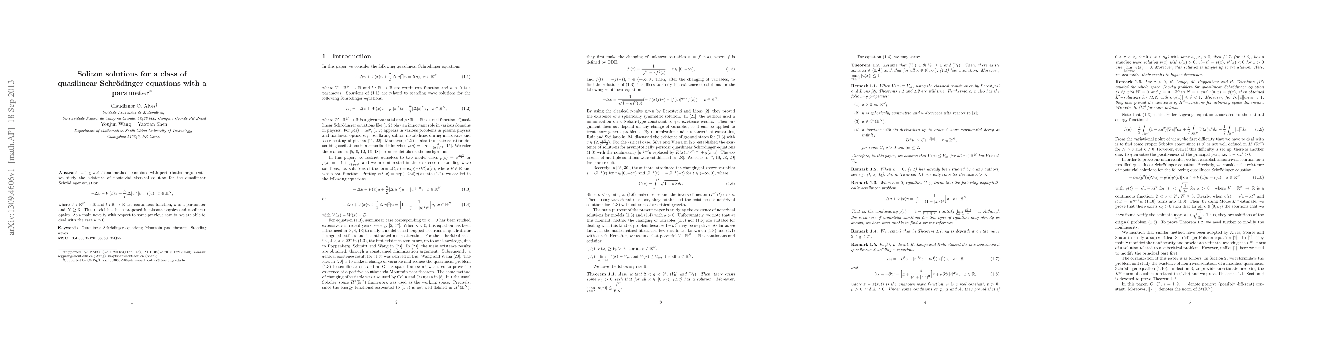 Using variational methods combined with perturbation arguments, we study the existence of nontrivial classical solution for the quasilinear Schr\"{o}dinger equation \begin{equation*}\label{1.1} -\Delta u+ V(x)u+ \frac{\kappa}{2}[\Delta |u|^2]u=l(u),\ x\in\mathbb{R}^N, \end{equation*} where $V:\mathbb{R}^N\rightarrow \mathbb{R}$ and $l:\mathbb{R} \to \mathbb{R}$ are continuous function, $\kappa$ is a parameter and $N\geq 3$. This model has been proposed in plasma physics and nonlinear optics. As a main novelty with respect to some previous results, we are able to deal with the case $\kappa>0$.