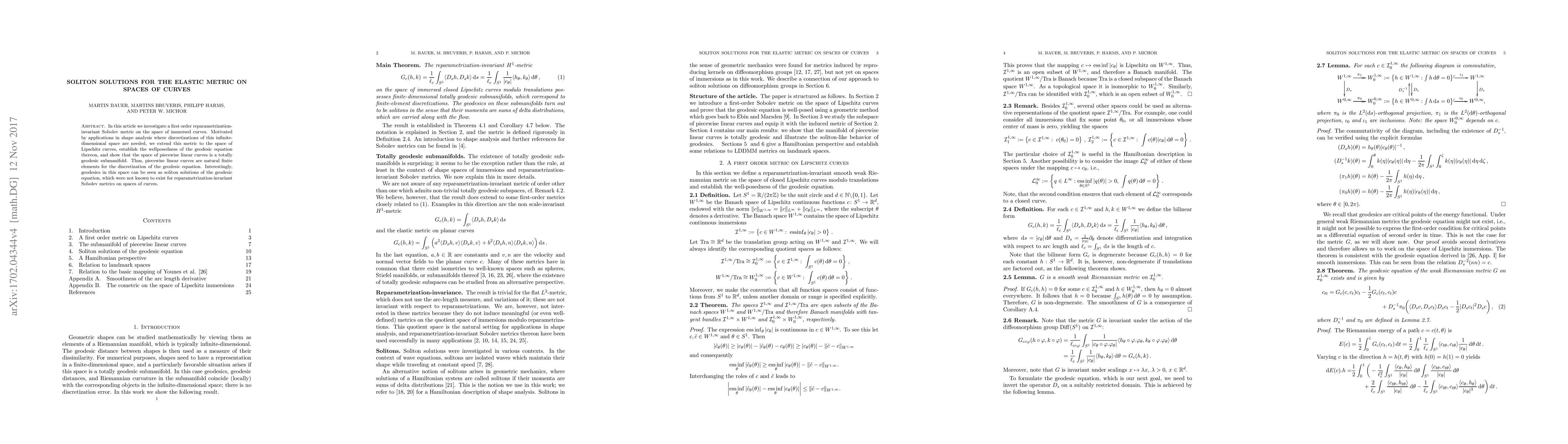 This paper explores a first-order reparametrization-invariant Sobolev metric on immersed curves, extending it to Lipschitz curves and proving the geodesic equation's wellposedness. It reveals soliton solutions for the geodesic equation, previously unknown for such metrics, and identifies piecewise linear curves as natural finite elements for discretization.