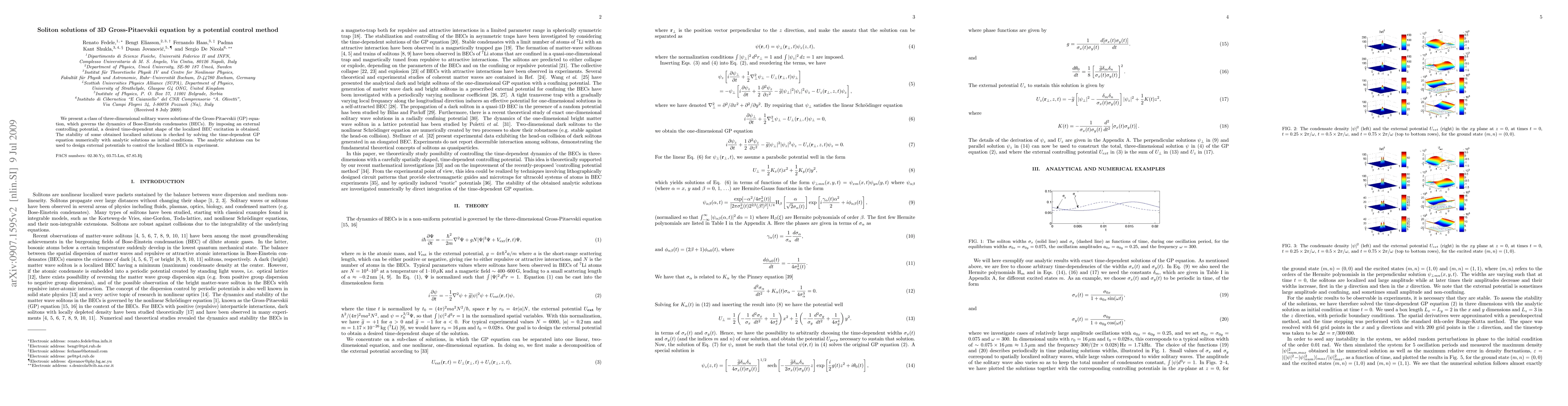 This paper presents three-dimensional soliton solutions of the Gross-Pitaevskii equation using a potential control method to shape localized Bose-Einstein condensate excitations. Numerical stability analysis of these solutions demonstrates their potential for experimental design in controlling BECs.