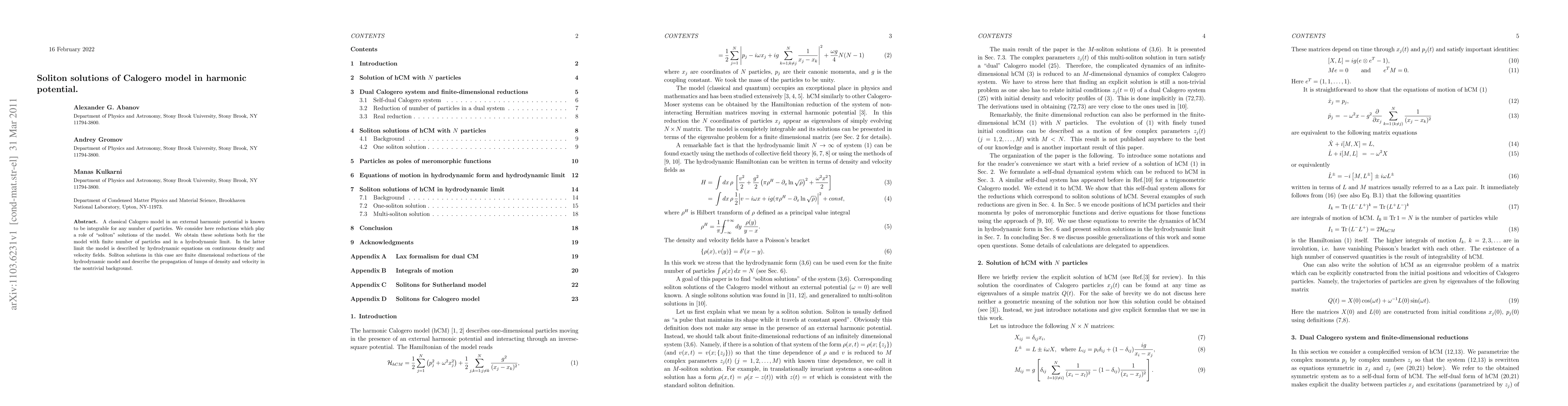 A classical Calogero model in an external harmonic potential is known to be integrable for any number of particles. We consider here reductions which play a role of "soliton" solutions of the model. We obtain these solutions both for the model with finite number of particles and in a hydrodynamic limit. In the latter limit the model is described by hydrodynamic equations on continuous density and velocity fields. Soliton solutions in this case are finite dimensional reductions of the hydrodynamic model and describe the propagation of lumps of density and velocity in the nontrivial background.