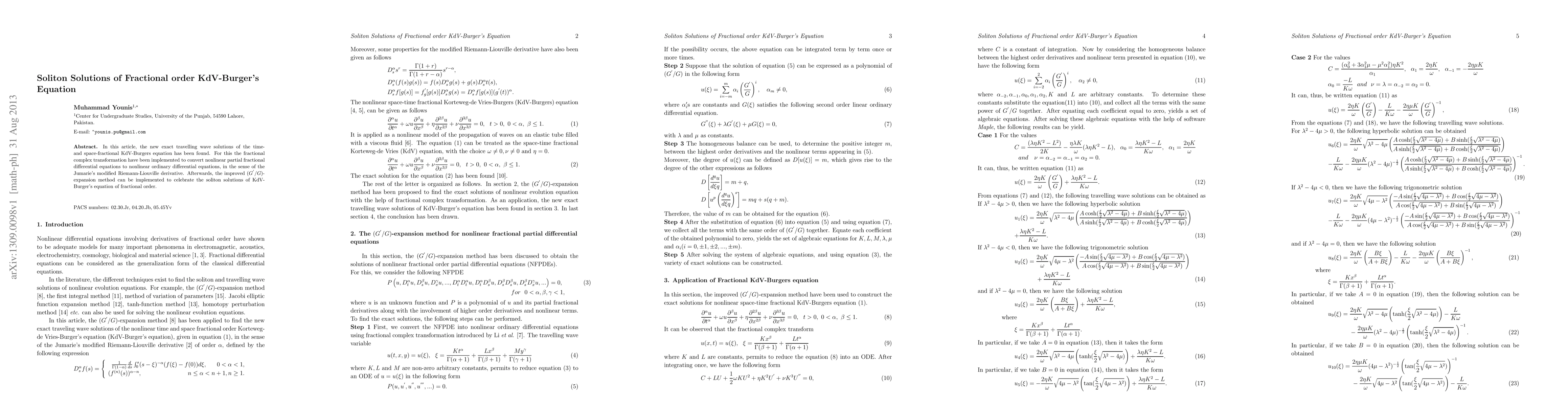 In this article, the new exact travelling wave solutions of the time-and space-fractional KdV-Burgers equation has been found. For this the fractional complex transformation have been implemented to convert nonlinear partial fractional differential equations to nonlinear ordinary differential equations, in the sense of the Jumarie's modified Riemann-Liouville derivative. Afterwards, the improved (G'/G)-expansion method can be implemented to celebrate the soliton solutions of KdV-Burger's equation of fractional order.