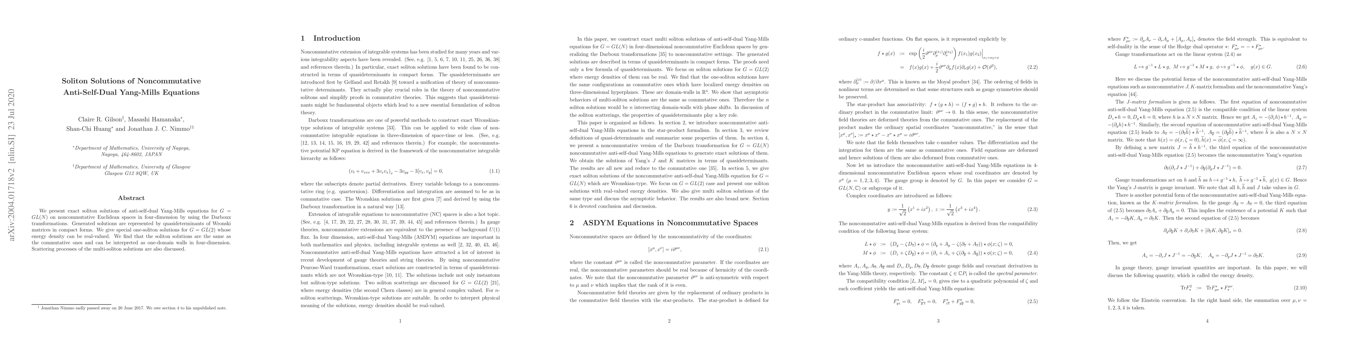 This paper presents soliton solutions for noncommutative anti-self-dual Yang-Mills equations in four dimensions using Darboux transformations, represented by quasideterminants of Wronski matrices, and shows that these solutions match their commutative counterparts and act as domain walls. The study also discusses scattering processes for multi-soliton configurations.