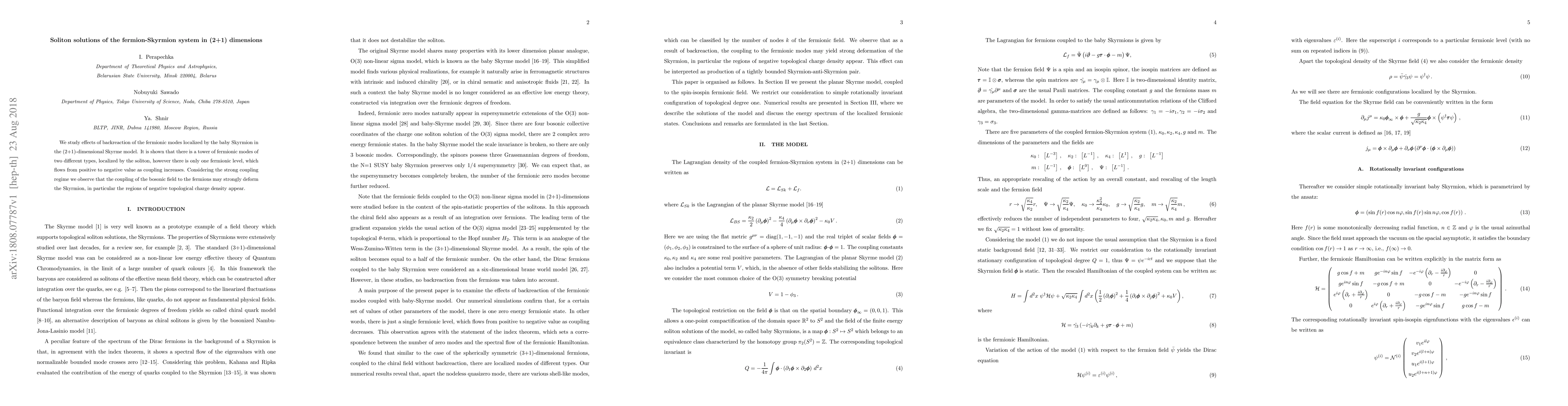 This research paper explores the effects of fermionic modes on the Skyrme model in (2+1) dimensions, revealing a tower of modes with only one level that changes sign as coupling increases, and showing strong deformation of the Skyrmion at high coupling.