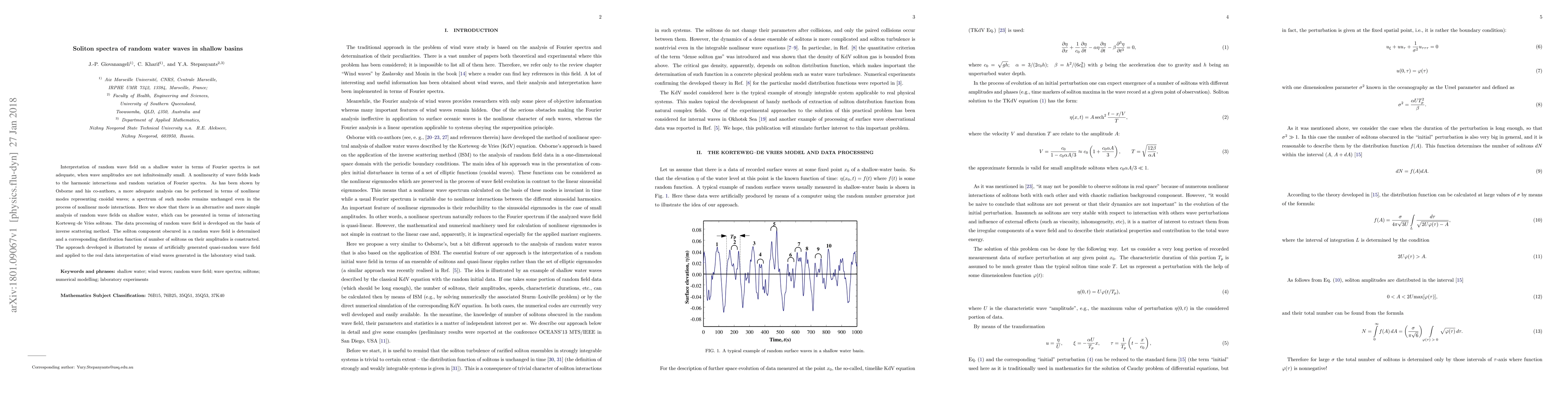 This paper proposes an alternative method for analyzing random water waves in shallow basins using interacting Korteweg-de Vries solitons instead of Fourier spectra. It employs the inverse scattering method to reveal the soliton component in the wave field and constructs a distribution function for the number of solitons based on their amplitudes.