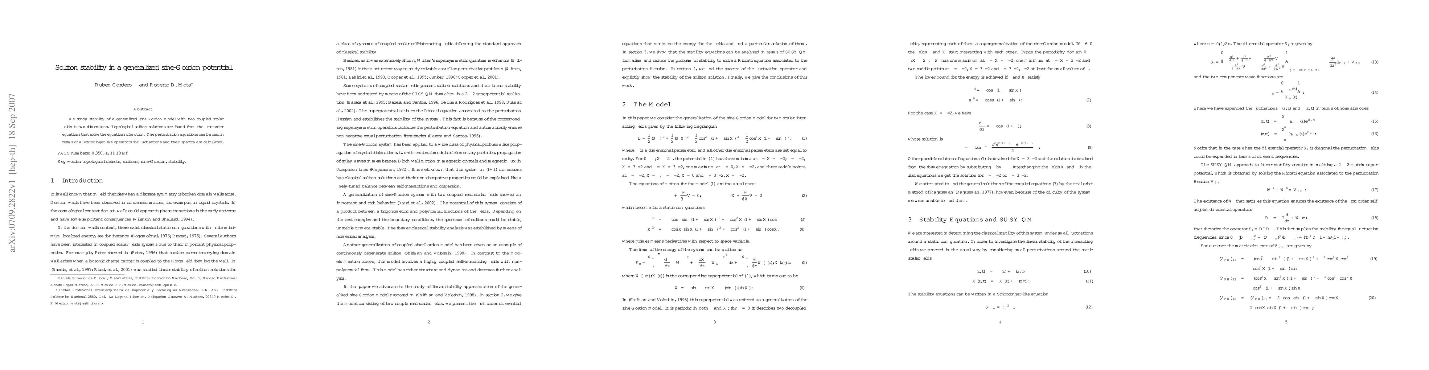 This paper investigates the stability of topological solitons in a generalized sine-Gordon model with two coupled scalar fields. It derives perturbation equations and analyzes their spectra using Schrödinger-like operators for fluctuation analysis.