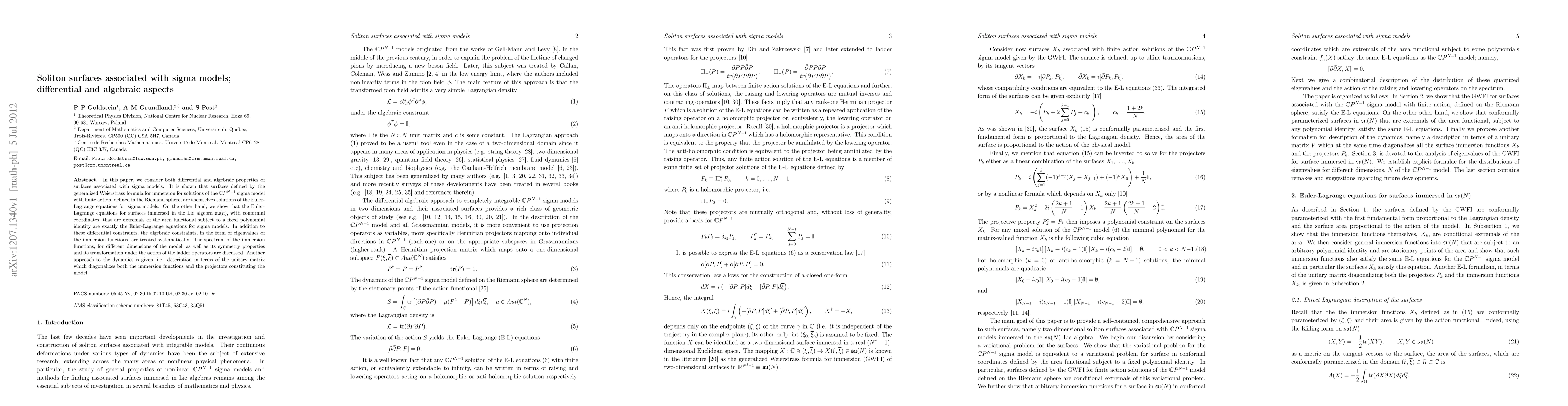 This paper explores both differential and algebraic properties of surfaces linked to sigma models, demonstrating that they satisfy Euler-Lagrange equations for these models. It also discusses the algebraic constraints via eigenvalues of immersion functions and the dynamics through unitary matrices.