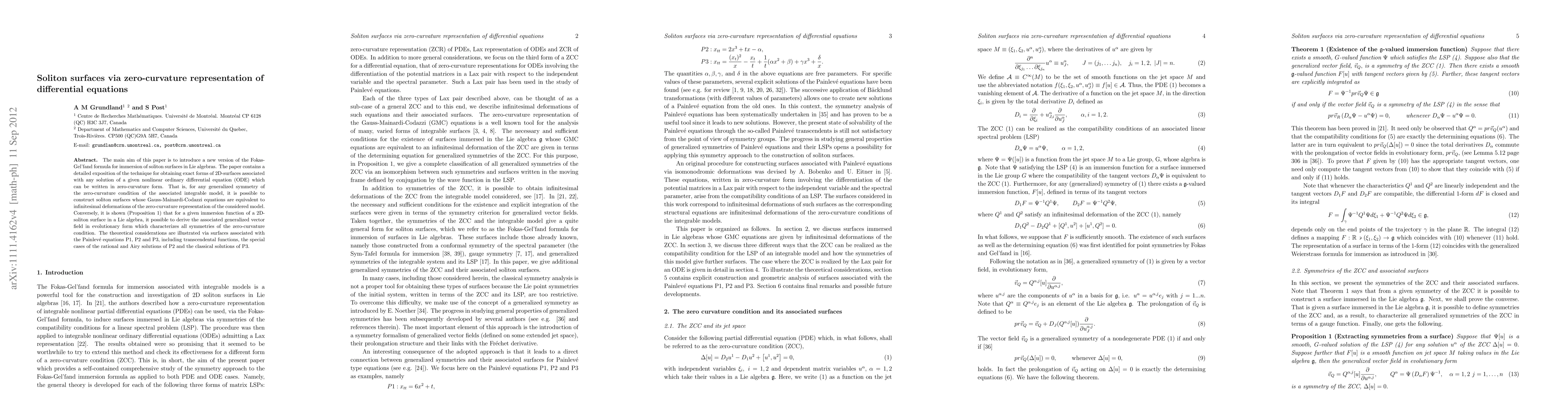 The main aim of this paper is to introduce a new version of the Fokas-Gel'fand formula for immersion of soliton surfaces in Lie algebras. The paper contains a detailed exposition of the technique for obtaining exact forms of 2D-surfaces associated with any solution of a given nonlinear ordinary differential equation (ODE) which can be written in zero-curvature form. That is, for any generalized symmetry of the zero-curvature condition of the associated integrable model, it is possible to construct soliton surfaces whose Gauss-Mainardi-Codazzi equations are equivalent to infinitesimal deformations of the zero-curvature representation of the considered model. Conversely, it is shown (Proposition 1) that for a given immersion function of a 2D-soliton surface in a Lie algebra, it possible to derive the associated generalized vector field in evolutionary form which characterizes all symmetries of the zero-curvature condition. The theoretical considerations are illustrated via surfaces associated with the Painlev\'e equations P1, P2 and P3, including transcendental functions, the special cases of the rational and Airy solutions of P2 and the classical solutions of P3.