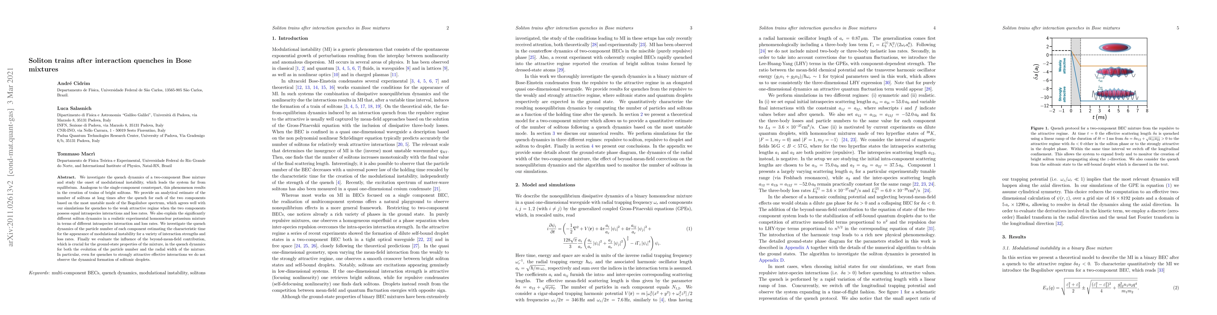 This paper studies the dynamics of soliton trains in a two-component Bose mixture following an interaction quench, revealing the onset of modulational instability and the creation of solitons. The authors provide analytical estimates for soliton numbers, comparing them with simulations and explaining differences in soliton dynamics in experimental settings.