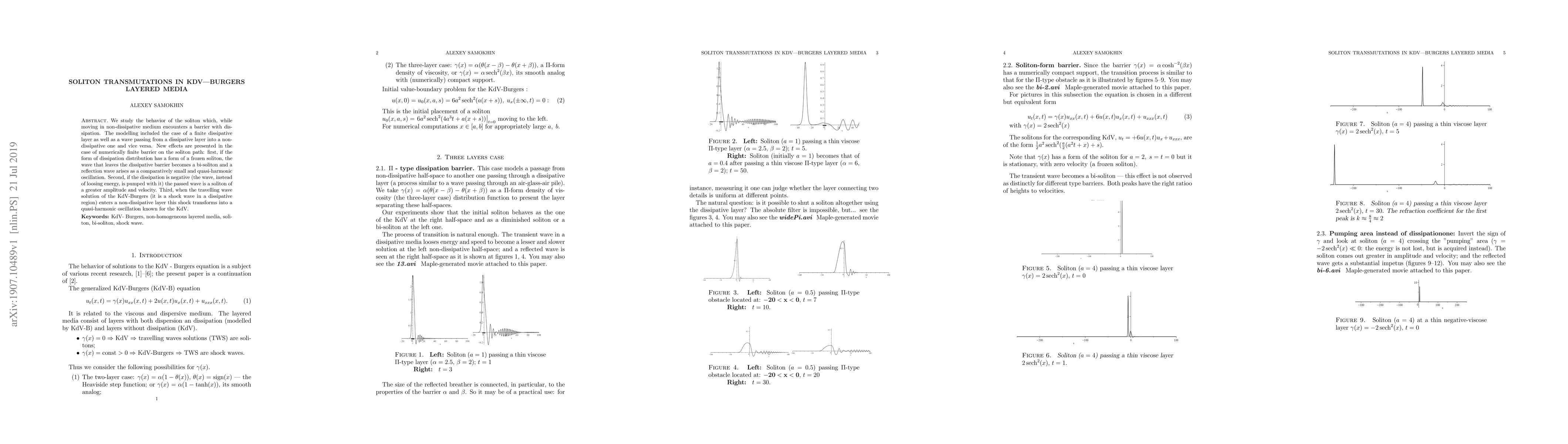 We study the behavior of the soliton which, while moving in non-dissipative medium encounters a barrier with dissipation. The modelling included the case of a finite dissipative layer as well as a wave passing from a dissipative layer into a non-dissipative one and vice versa. New effects are presented in the case of numerically finite barrier on the soliton path: first, if the form of dissipation distribution has a form of a frozen soliton, the wave that leaves the dissipative barrier becomes a bi-soliton and a reflection wave arises as a comparatively small and quasi-harmonic oscillation. Second, if the dissipation is negative (the wave, instead of loosing energy, is pumped with it) the passed wave is a soliton of a greater amplitude and velocity. Third, when the travelling wave solution of the KdV-Burgers (it is a shock wave in a dissipative region) enters a non-dissipative layer this shock transforms into a quasi-harmonic oscillation known for the KdV.