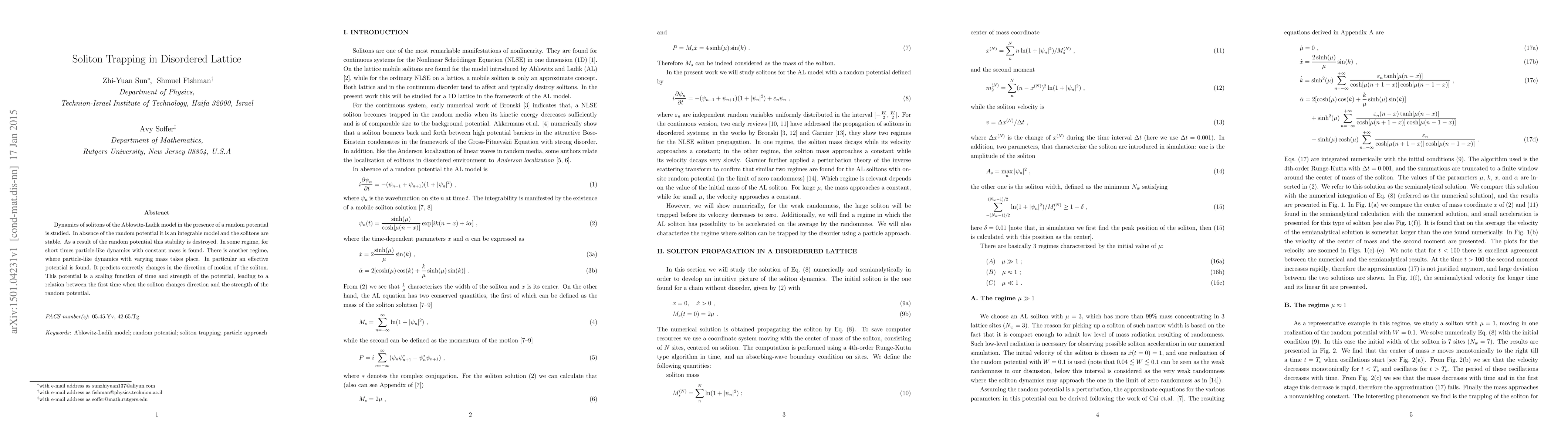 Researchers studied soliton dynamics in a disordered lattice with a random potential, finding two regimes of particle-like behavior: one with constant mass and another with varying mass, including an effective potential that predicts direction changes based on the potential's strength and time.