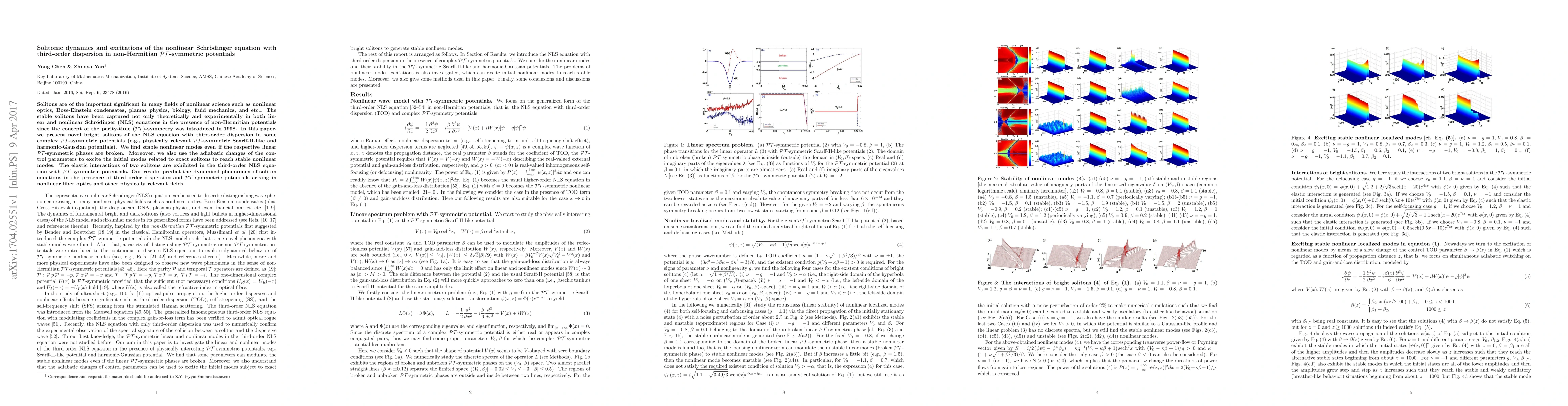 This paper explores the dynamics and excitations of solitons in the nonlinear Schrödinger equation with third-order dispersion within non-Hermitian PT-symmetric potentials. It reveals stable solitons and nonlinear modes even when linear PT-symmetry is broken, and demonstrates elastic soliton interactions, with implications for nonlinear fiber optics and related fields.