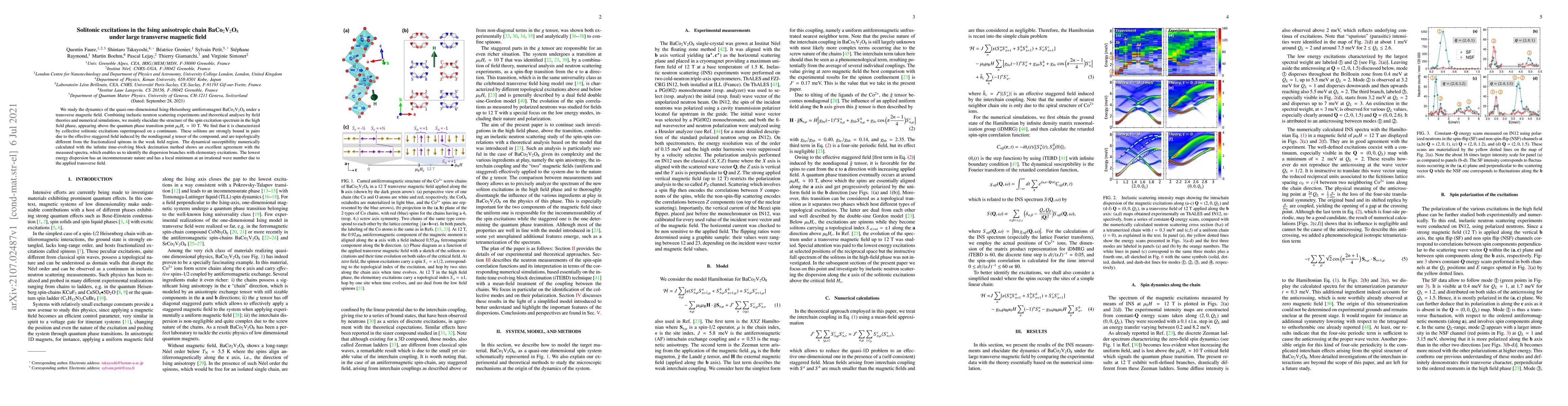 This study investigates the spin excitation spectrum in BaCo2V2O8 under large transverse magnetic fields, revealing solitonic excitations above the quantum phase transition point. These solitons are paired due to an effective staggered field and differ topologically from spinons in weaker fields, with numerical simulations matching experimental neutron scattering data.