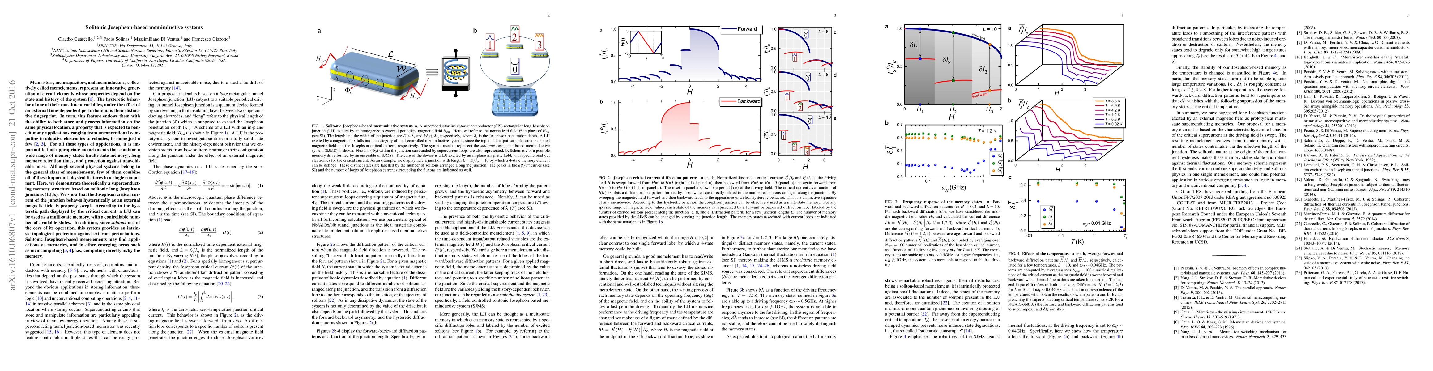 Memristors, memcapacitors, and meminductors, collectively called memelements, represent an innovative generation of circuit elements whose properties depend on the state and history of the system. The hysteretic behavior of one of their constituent variables, under the effect of an external time-dependent perturbation, is their distinctive fingerprint. In turn, this feature endows them with the ability to both store and process information on the same physical location, a property that is expected to benefit many applications ranging from unconventional computing to adaptive electronics to robotics, to name just a few. For all these types of applications, it is important to find appropriate memelements that combine a wide range of memory states (multi-state memory), long memory retention times, and protection against unavoidable noise. Although several physical systems belong to the general class of memelements, few of them combine all of these important physical features in a single component. Her we demonstrate theoretically a superconducting memory structure based on solitonic long Josephson junctions (LJJs). We show that the Josephson critical current of the junction behaves hysteretically as an external magnetic field is properly swept. According to the hysteretic path displayed by the critical current, a LJJ can be used as a multi-state memory, with a controllable number of available states. In addition, since solitons are at the core of its operation, this system provides an intrinsic topological protection against external perturbations. Solitonic Josephson-based memelements may find applications as memories, and in other emerging areas such as memcomputing, i.e., computing directly in/by the memory.