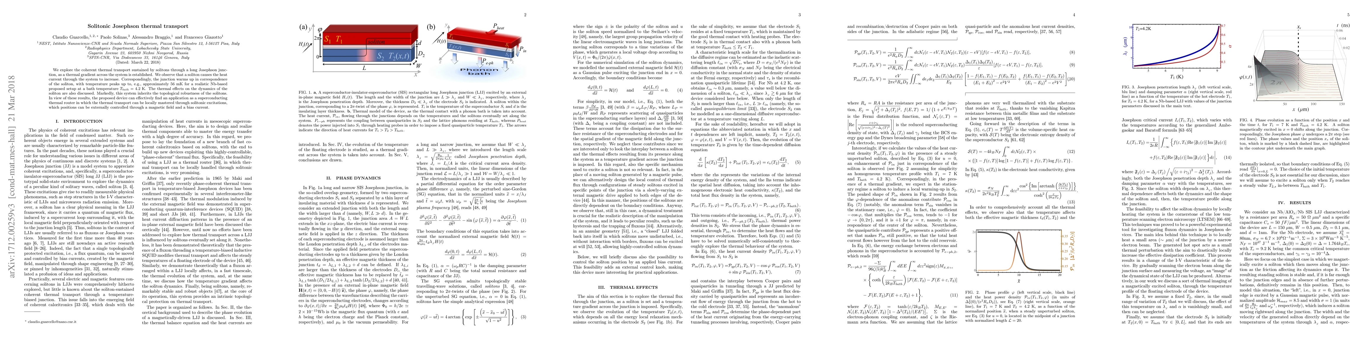 We explore the coherent thermal transport sustained by solitons through a long Josephson junction, as a thermal gradient across the system is established. We observe that a soliton causes the heat current through the system to increase. Correspondingly, the junction warms up in correspondence of the soliton, with temperature peaks up to, e.g., approximately 56 mK for a realistic Nb-based proposed setup at a bath temperature Tbath = 4.2 K. The thermal effects on the dynamics of the soliton are also discussed. Markedly, this system inherits the topological robustness of the solitons. In view of these results, the proposed device can effectively find an application as a superconducting thermal router in which the thermal transport can be locally mastered through solitonic excitations, which positions can be externally controlled through a magnetic field and a bias current.