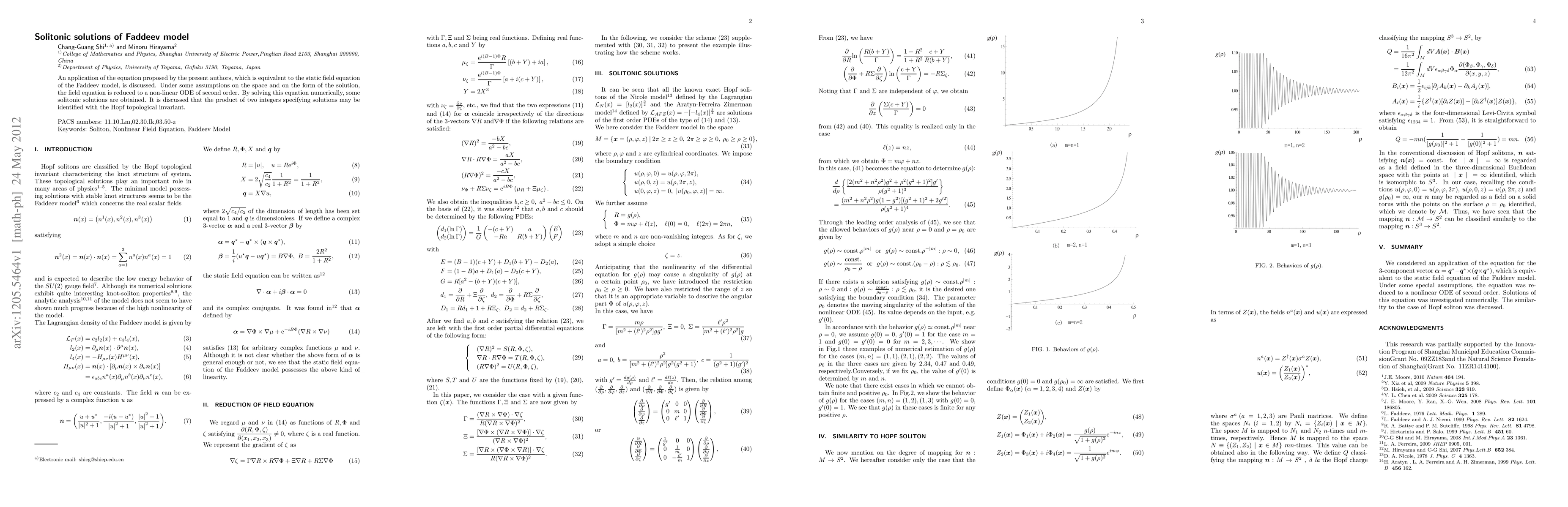 An application of the equation proposed by the present authors, which is equivalent to the static field equation of the Faddeev model, is discussed. Under some assumptions on the space and on the form of the solution, the field equation is reduced to a non-linear ODE of second order. By solving this equation numerically, some solitonic solutions are obtained. It is discussed that the product of two integers specifying solutions may be identified with the Hopf topological invariant.