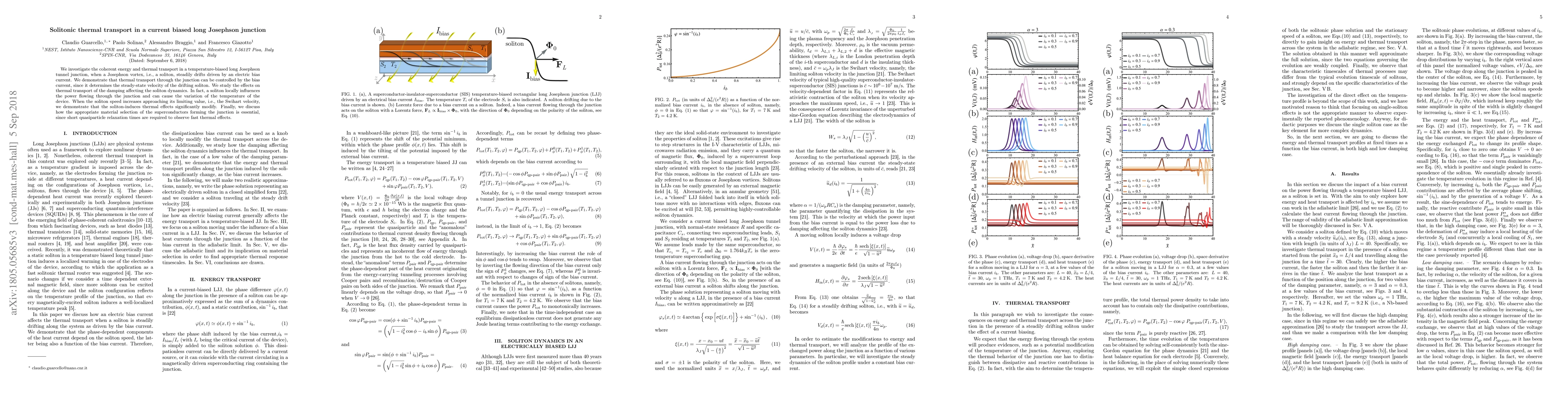 This paper explores the thermal transport in a long Josephson junction driven by a bias current, focusing on how solitons (Josephson vortices) influence energy and thermal flow. The study reveals that the bias current controls thermal transport by determining the soliton's steady-state velocity, with material selection crucial for observing rapid thermal effects due to short quasiparticle relaxation times.