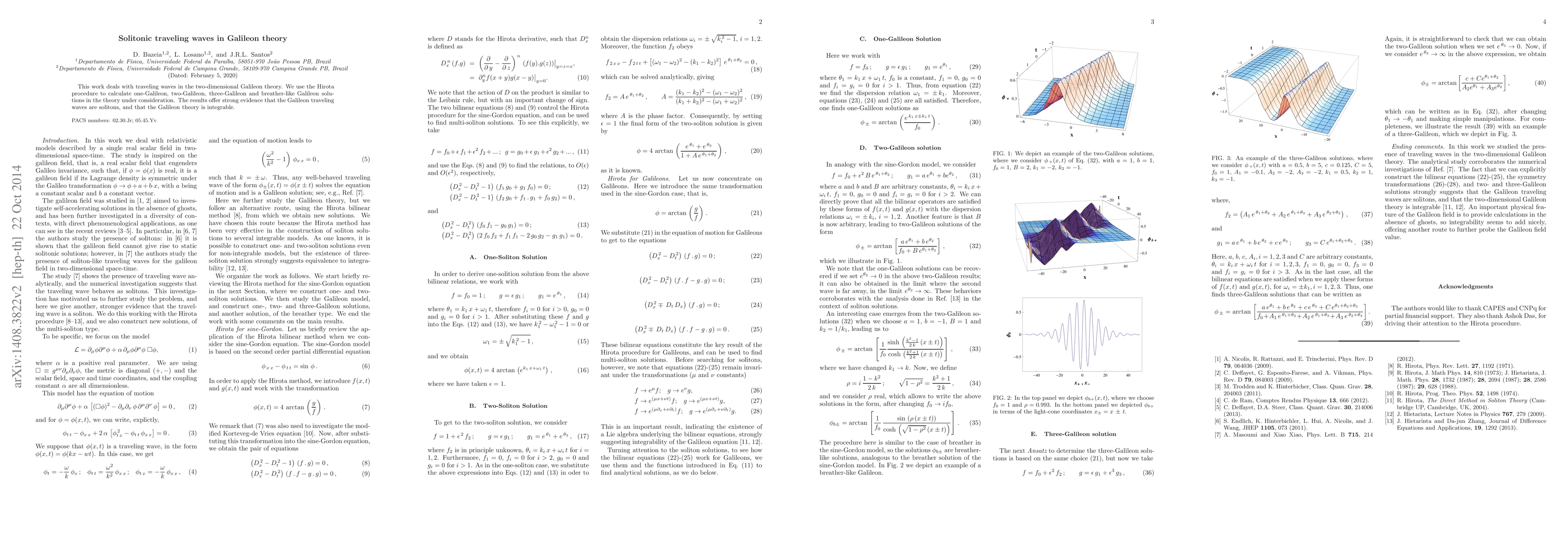 This work deals with traveling waves in the two-dimensional Galileon theory. We use the Hirota procedure to calculate one-Galileon, two-Galileon, three-Galileon and breather-like Galileon solutions in the theory under consideration. The results offer strong evidence that the Galileon traveling waves are solitons, and that the Galileon theory is integrable.