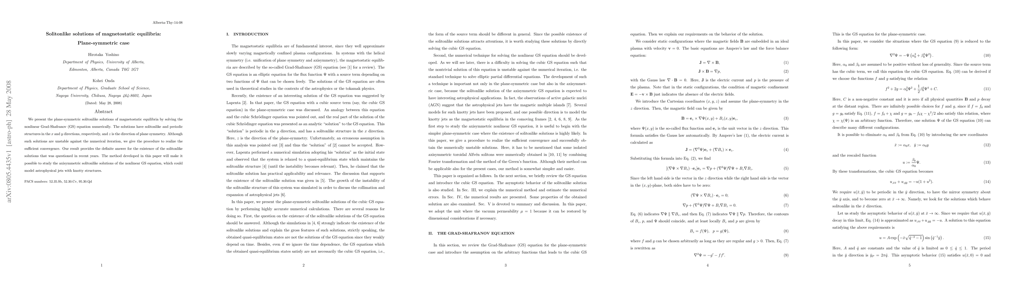 This paper presents plane-symmetric solitonlike solutions to magnetostatic equilibria by numerically solving the nonlinear Grad-Shafranov equation, revealing solitonlike and periodic structures. Despite numerical instability, the authors detail a procedure for convergence, confirming the existence of such solutions and enabling future studies of axisymmetric solitonlike solutions for modeling astrophysical jets.