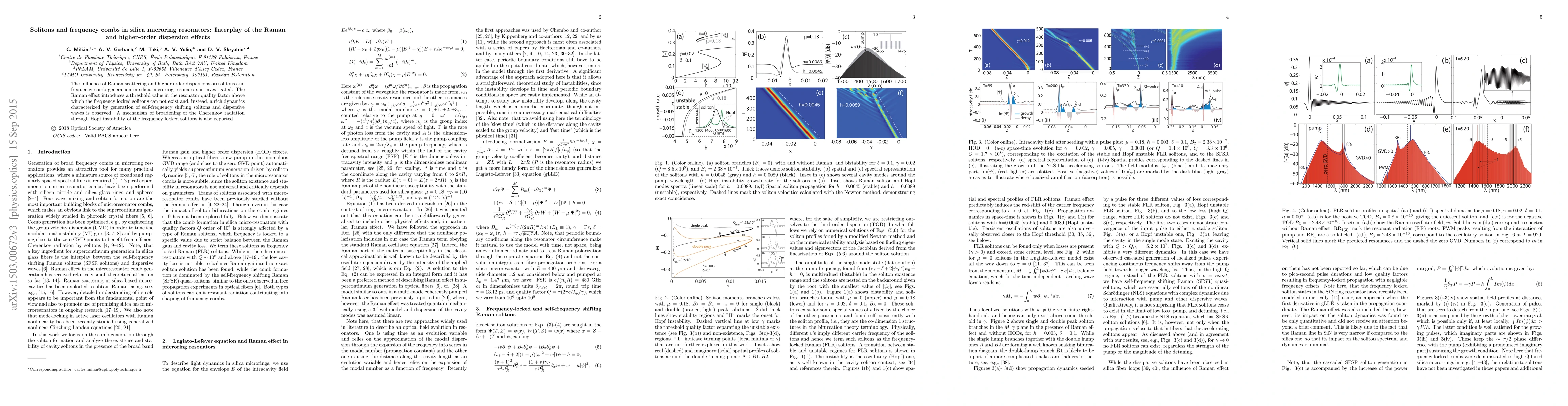 The influence of Raman scattering and higher order dispersions on solitons and frequency comb generation in silica microring resonators is investigated. The Raman effect introduces a threshold value in the resonator quality factor above which the frequency locked solitons can not exist and, instead, a rich dynamics characterized by generation of self-frequency shift- ing solitons and dispersive waves is observed. A mechanism of broadening of the Cherenkov radiation through Hopf instability of the frequency locked solitons is also reported.