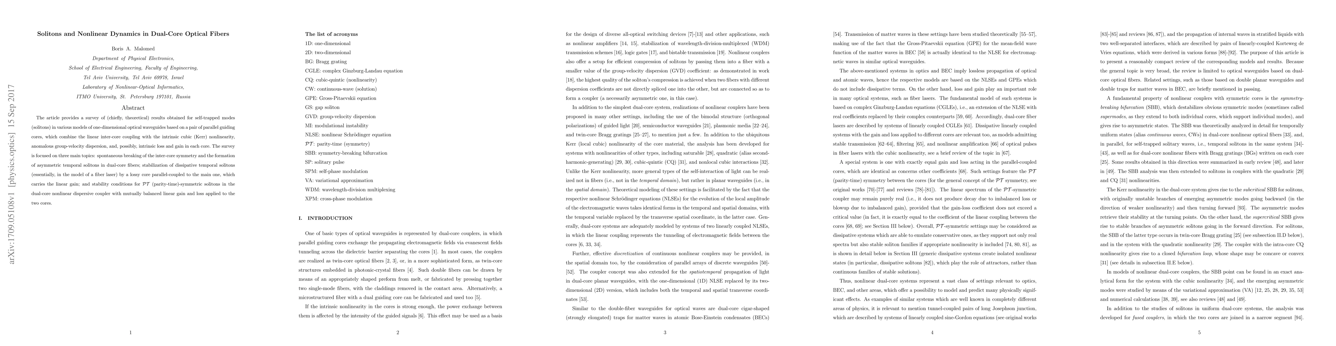 The article provides a survey of (chiefly, theoretical) results obtained for self-trapped modes (solitons) in various models of one-dimensional optical waveguides based on a pair of parallel guiding cores, which combine the linear inter-core coupling with the intrinsic cubic (Kerr) nonlinearity, anomalous group-velocity dispersion, and, possibly, intrinsic loss and gain in each core. The survey is focused on three main topics: spontaneous breaking of the inter-core symmetry and the formation of asymmetric temporal solitons in dual-core fibers; stabilization of dissipative temporal solitons (essentially, in the model of a fiber laser) by a lossy core parallel-coupled to the main one, which carries the linear gain; and stability conditions for PT (parity-time)-symmetric solitons in the dual-core nonlinear dispersive coupler with mutually balanced linear gain and loss applied to the two cores.